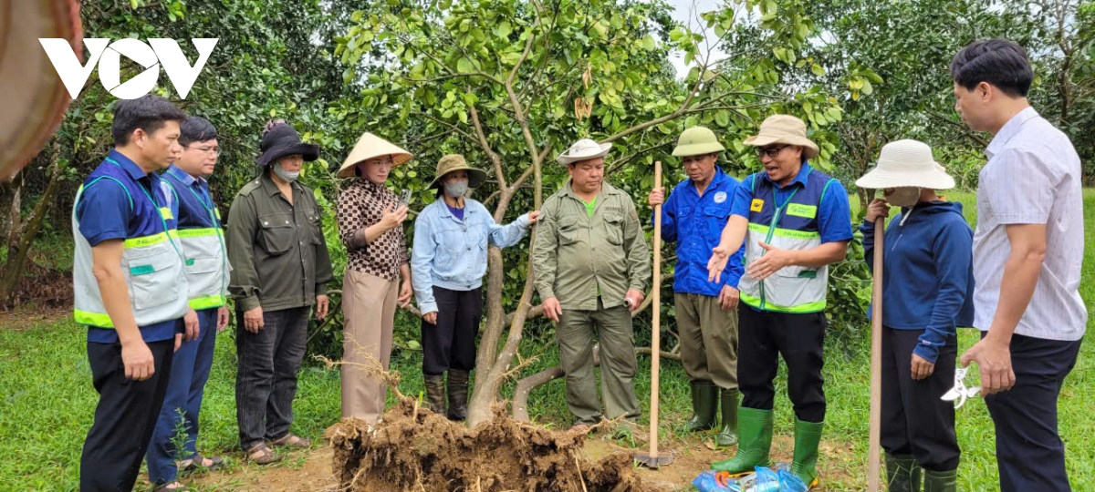 Tại vườn bưởi của gia đình ông Phan Xuân Hiến, các chuyên gia khuyến nông đã hướng dẫn bà con chi tiết từ kỹ thuật xử lý rễ và vết thương do mưa bão, cải tạo tầng đất canh tác, bổ sung phân hữu cơ nhằm kích thích phục hồi rễ cây. Hướng dẫn cắt tỉa cành gãy, dựng lại cây bị đổ, sử dụng phân vi sinh để giúp cây trồng phục hồi sau mưa bão.