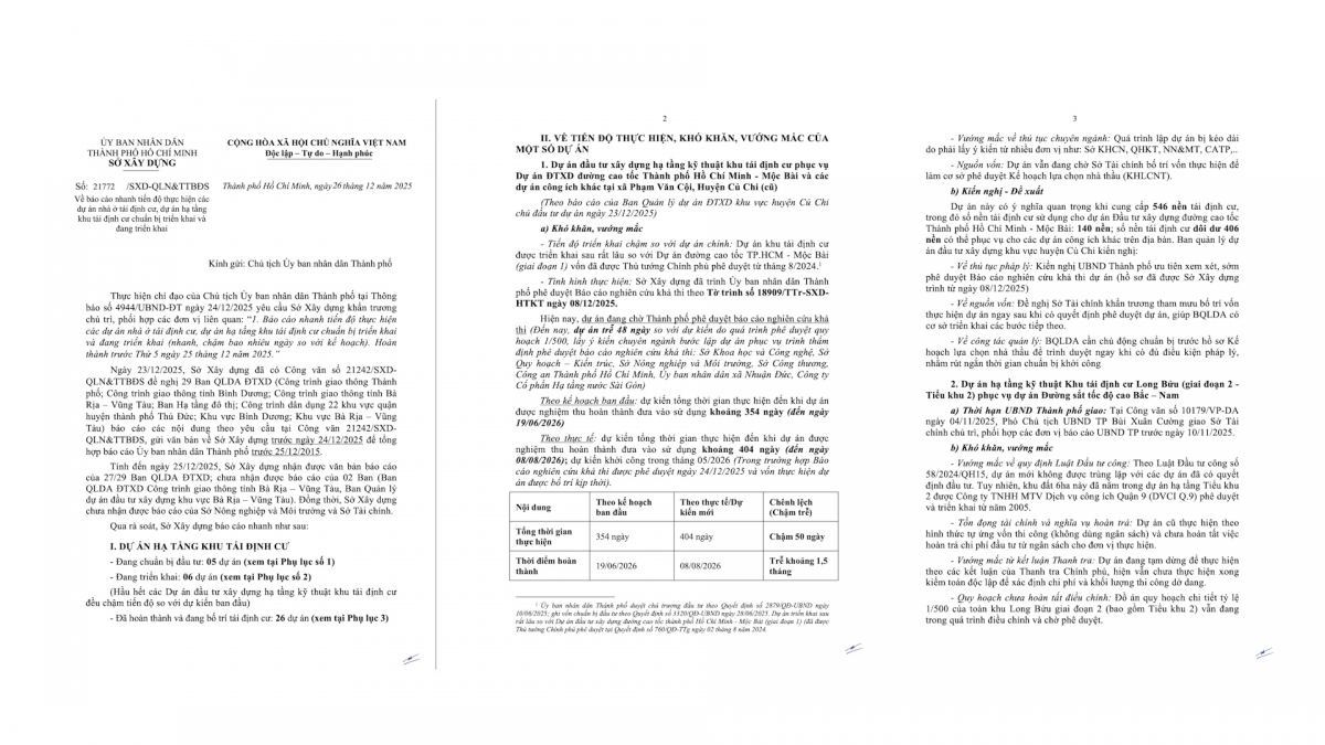 Việc kéo dài quá lâu khiến dự án rơi vào tình trạng “chồng lấn” pháp lý, gây khó khăn trong việc lập báo cáo đề xuất chủ trương đầu tư dự án mới phục vụ dự án đường sắt tốc độ cao theo Luật Đầu tư công năm 2024. Từ đó, Sở Xây dựng đã có văn bản đề nghị Sở Tài chính căn cứ các quy định pháp luật chuyên ngành để hướng dẫn Ban Quản lý dự án đầu tư hạ tầng đô thị TP.HCM lập báo cáo đề xuất chủ trương đầu tư. Trường hợp phát sinh khó khăn, vướng mắc, các đơn vị cần tổng hợp, báo cáo UBND TP.HCM xem xét, quyết định.