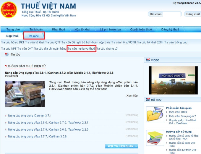 Bước 2: Chọn mục Tra cứu rồi chọn Tra cứu nghĩa vụ thuế