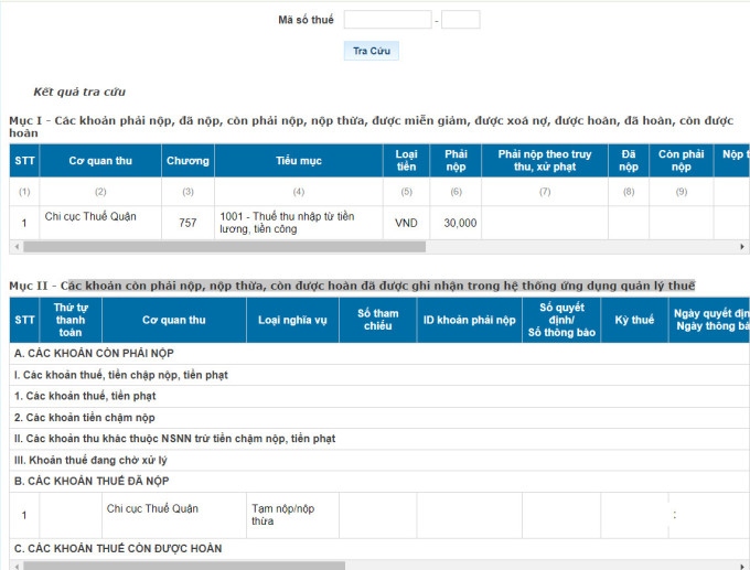 Mục II: Các khoản còn phải nộp, nộp thừa, còn được hoàn đã được ghi nhận trong hệ thống ứng dụng quản lý thuế.