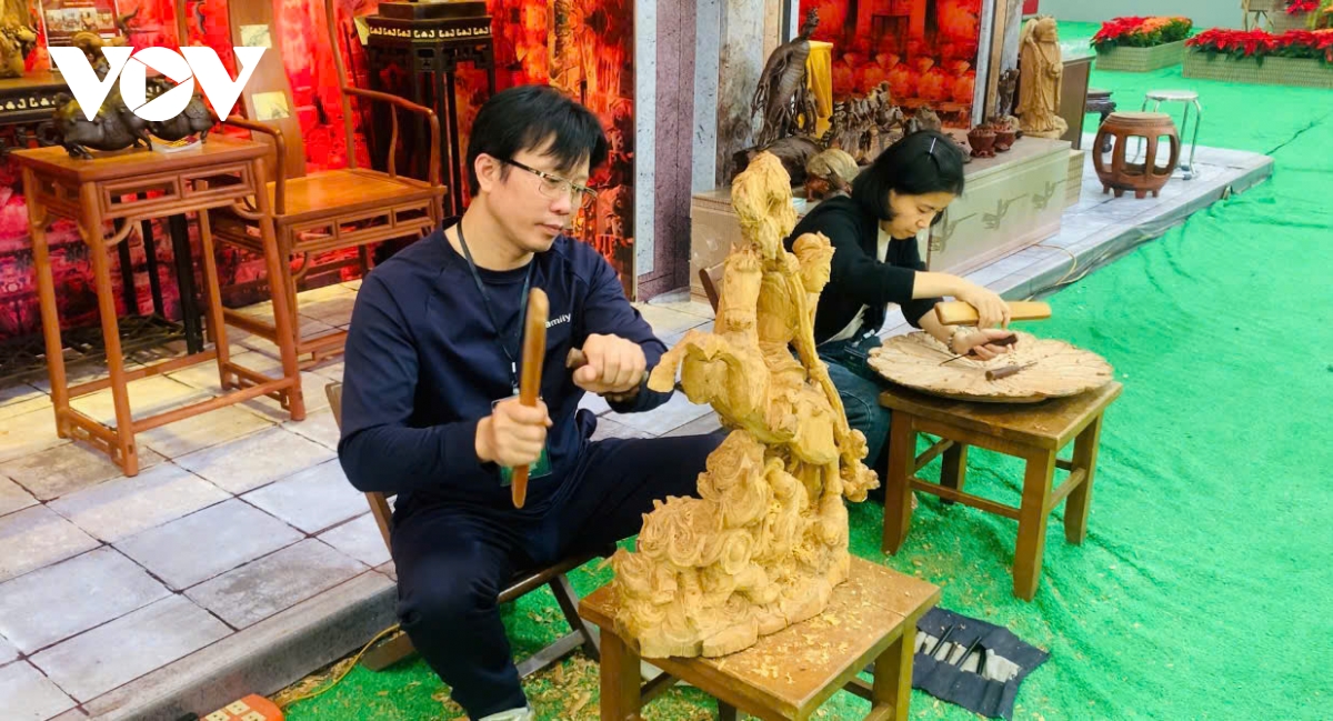 Nghệ nhân ưu tú Đỗ Văn Cường trình diễn điêu khắc gỗ.