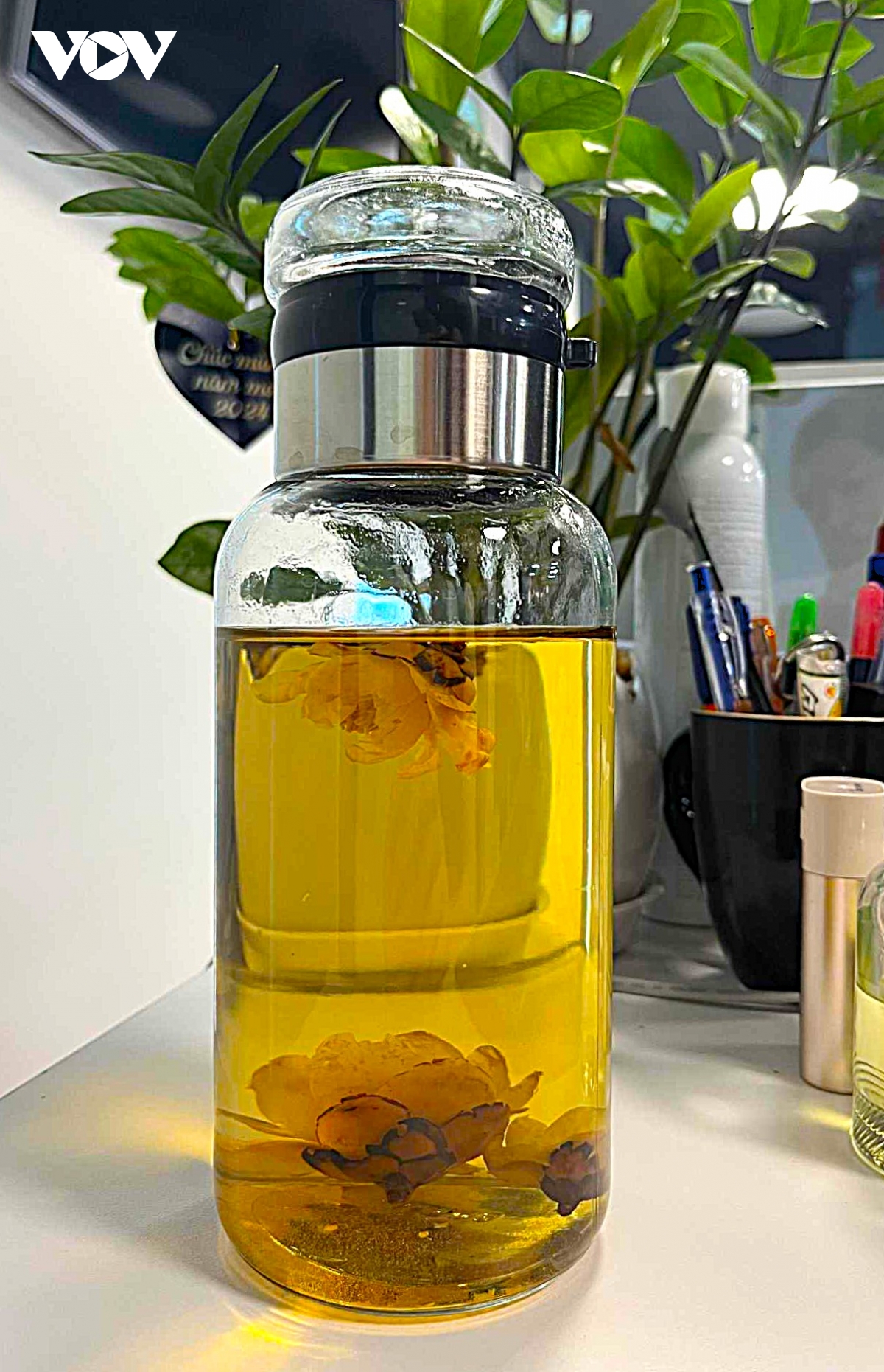 Bình đựng trà hoa vàng đã pha sẵn từ nhà mang tới công sở của chị Nga, trú ở Hà Nội. “Trà sau khi pha có màu nước vàng óng, vị thơm đặc trưng, dễ uống..”, chị Nga nhận xét.