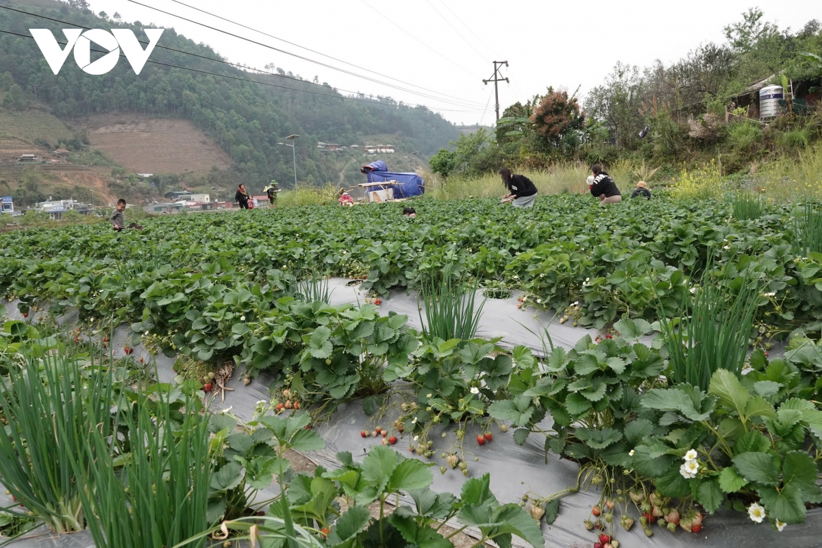 Gia đình anh Giàng A Sở ở bản Háng Gàng, xã Lao Chải, huyện Mù Cang Chải cũng đi học hỏi nhiều nơi và nghiên cứu rất kĩ về khí hậu, thời tiết quê mình trước khi đưa cây dâu tây vào trồng. Cuối năm ngoái, anh đi mua 3.200 gốc dâu tây từ Sơn La về trồng trên diện tích đất ruộng 3.000m2. Đến nay, diện tích dâu đã cho thu hoạch, mới mấy ngày đầu vụ, gia đình đã thu gần 20 triệu đồng.