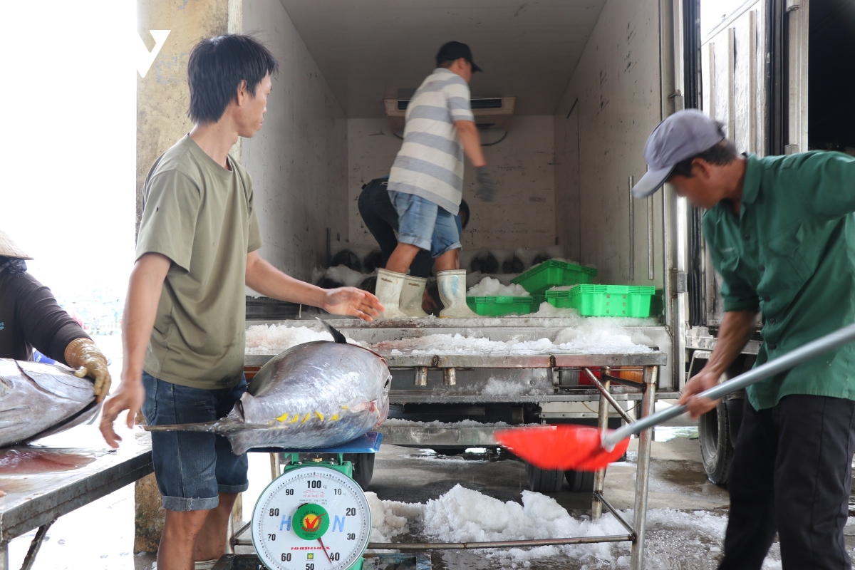 Ngư dân Phú Yên đưa cá ngừ đại dương lên bờ bán cho thương lái.