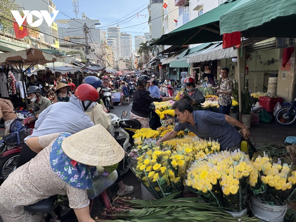 Trái ngược với siêu thị, tại nhiều chợ truyền thống không khí mua bán sôi động hơn. Người dân chủ yếu mua hoa tươi, thịt cá tươi sống, giấy tiền vàng mã và trái cây cúng giao thừa.