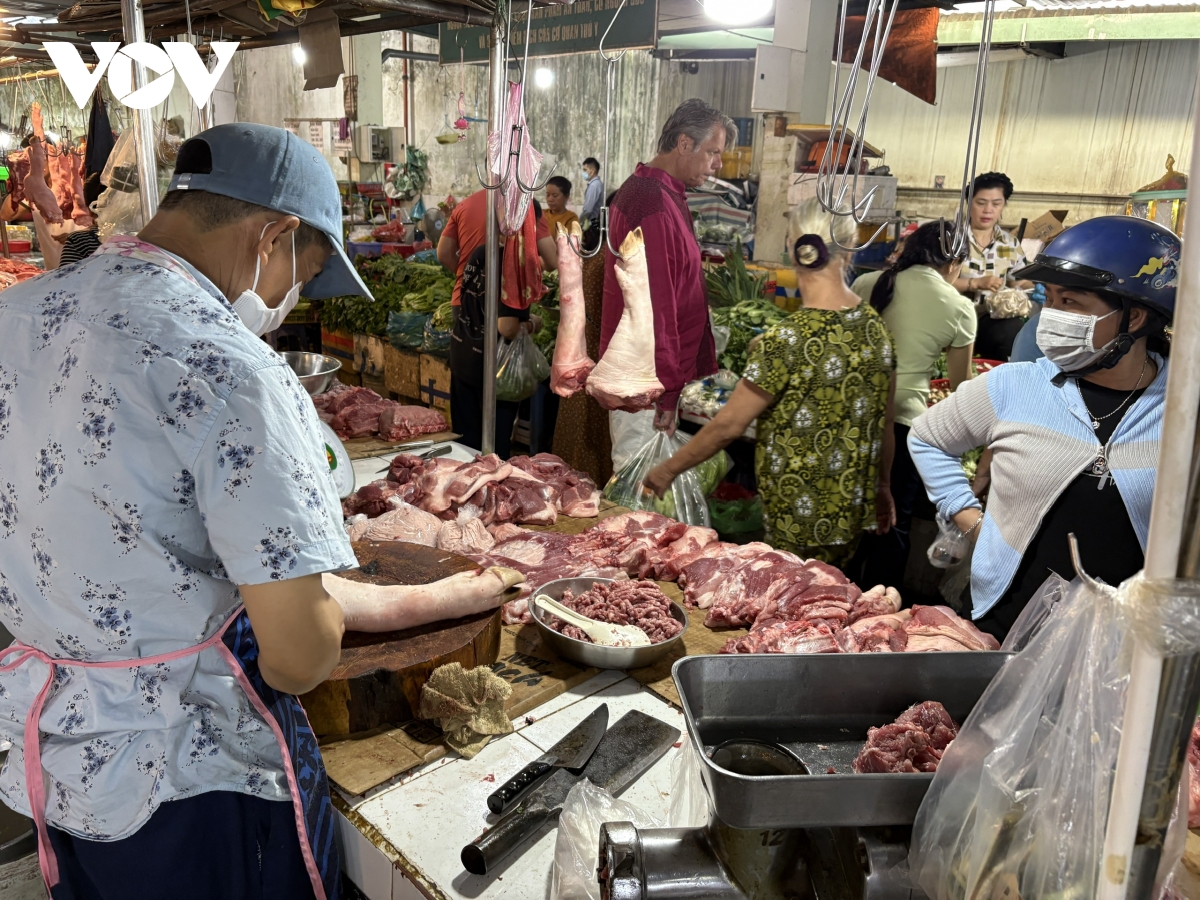 Tại chợ Thảo Điền và chợ Thị Nghè, các quầy rau củ, thịt luôn trong tình trạng đông khách. Bên cạnh đó, nhiều người tìm mua nguyên liệu chuẩn bị mâm cúng giao thừa như bánh chưng, xôi, thịt quay.