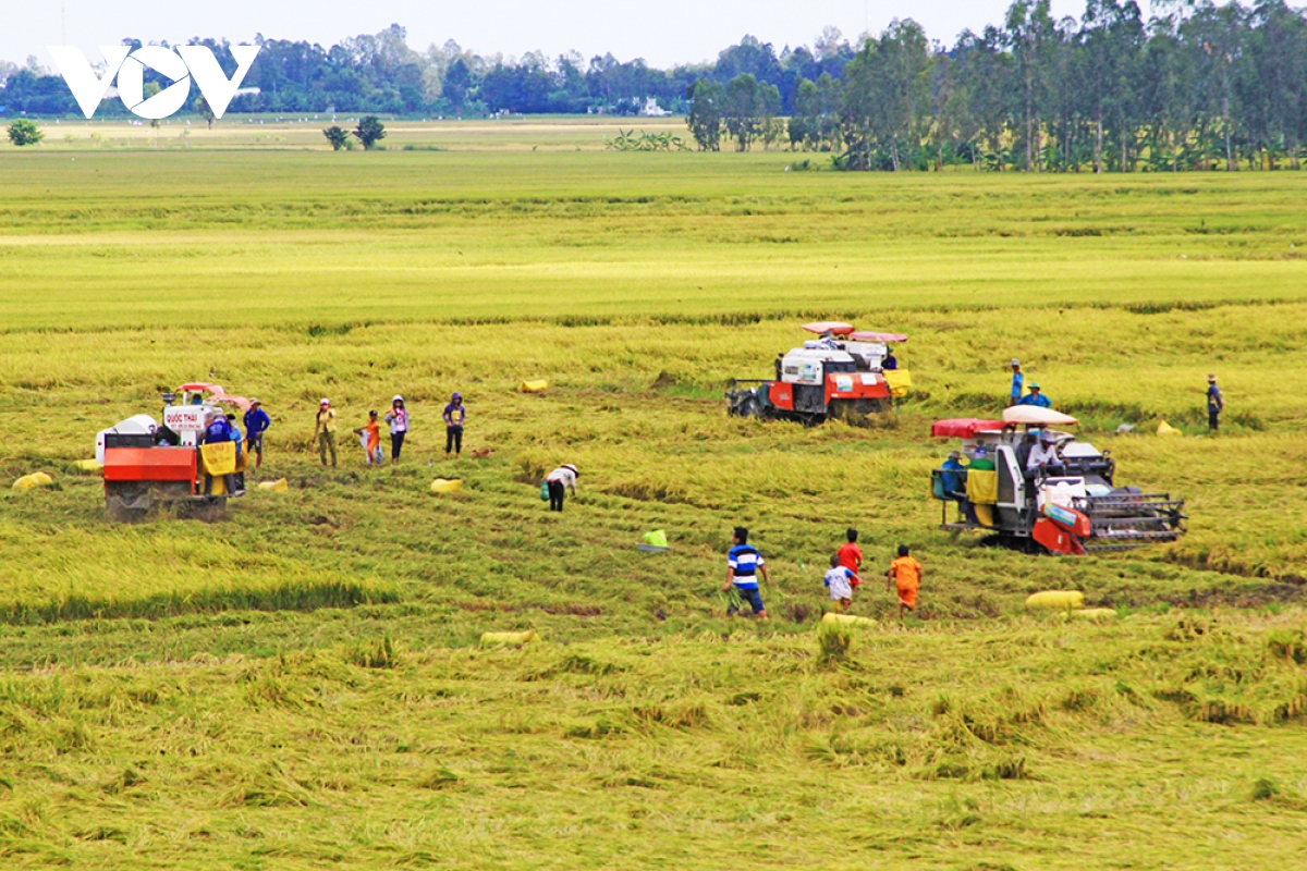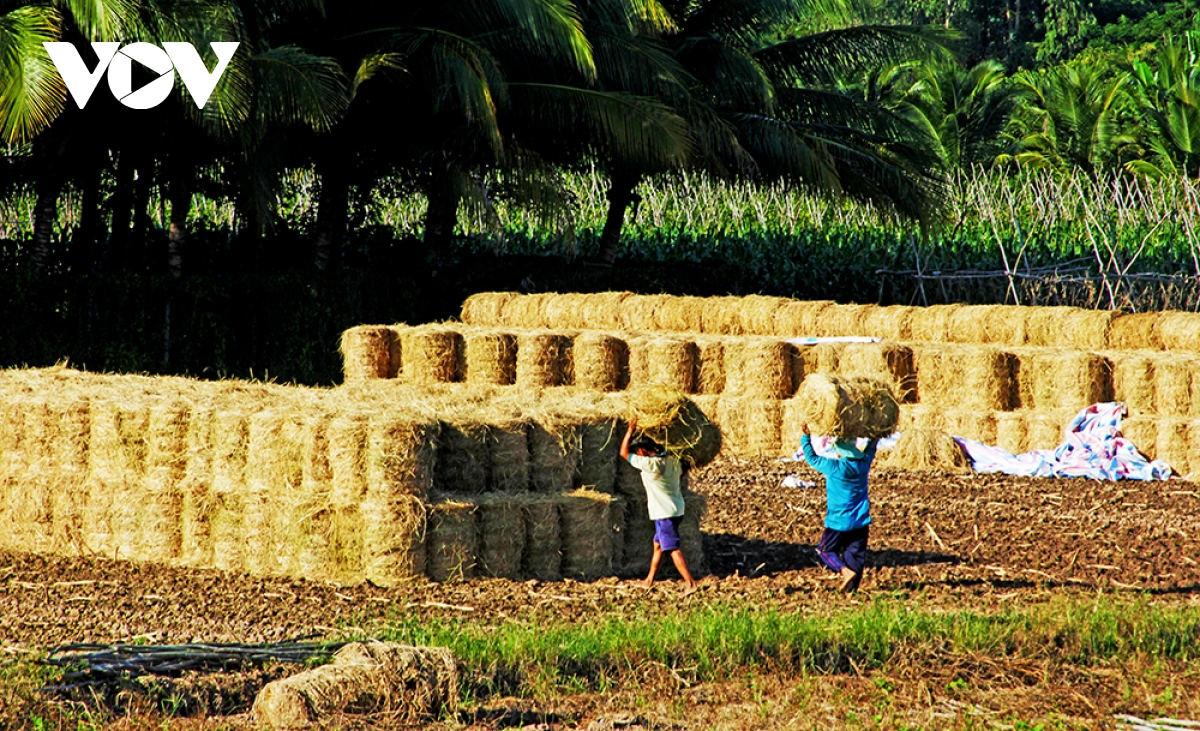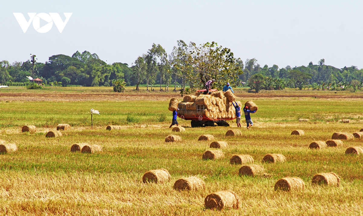 VOV.VN - Sau khi thu hoạch lúa người dân miền Tây tận dụng rơm rạ để bán, trồng nấm và ủ thành phân hữu cơ. Giá bán rơm tại đồng ruộng dao động từ 400 đến 500.000 đồng/ha. Bình quân mỗi hecta máy sẽ cuốn được từ 170 – 180 cuộn rơm với giá bán từ 15.000 đến 20.000 đồng/cuộn. Nhiều khi hút hàng giá bán mỗi cuộn rơm có thể lên đến 25.000- 30.000 đồng.