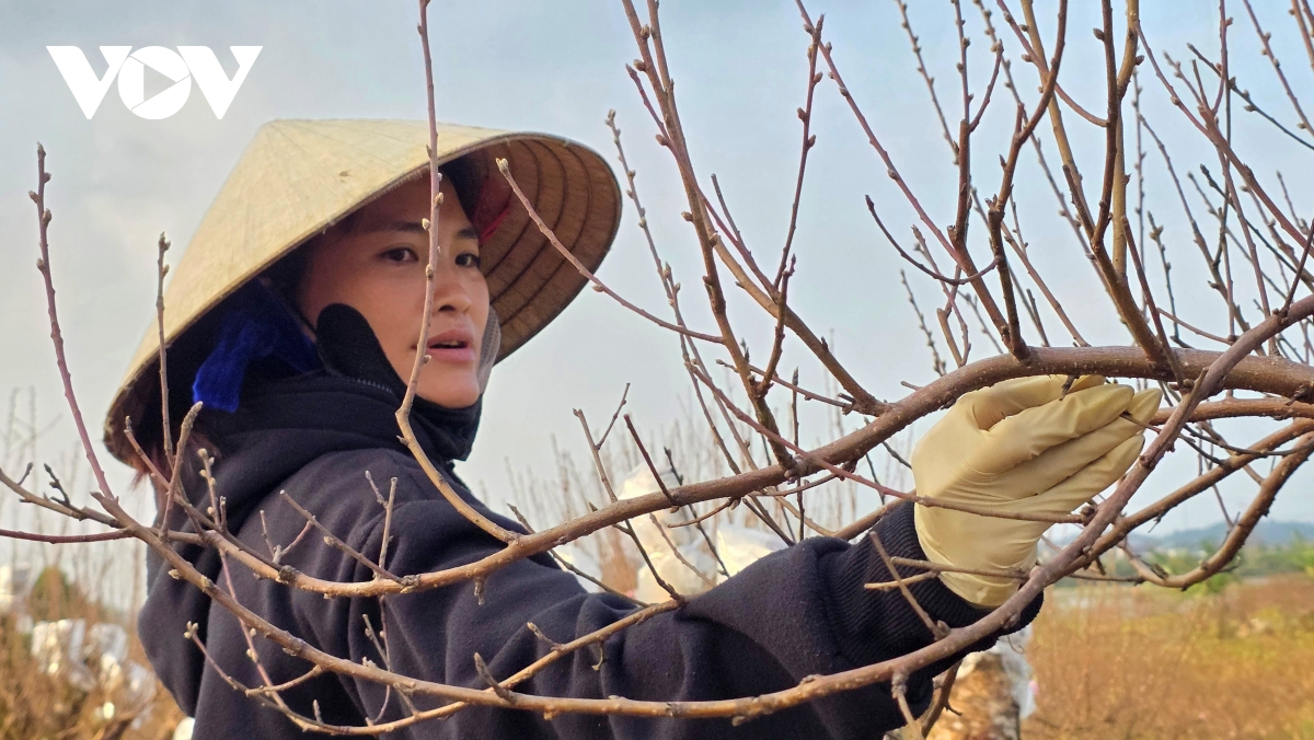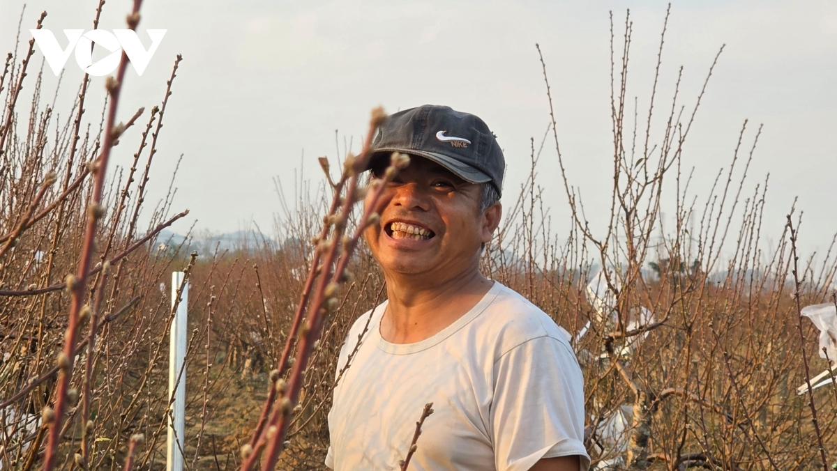 Vườn đào của gia đình anh Lê Văn Huân, trồng khoảng 1 ha, thương lái đã đặt mua trước đó 2 tháng. Anh Huân tự tin, với giá bán ổn định và cao hơn năm ngoái sau khi trừ chi phí thì gia đình anh có thể thu về khoảng 500 triệu đồng trong vụ tết này.