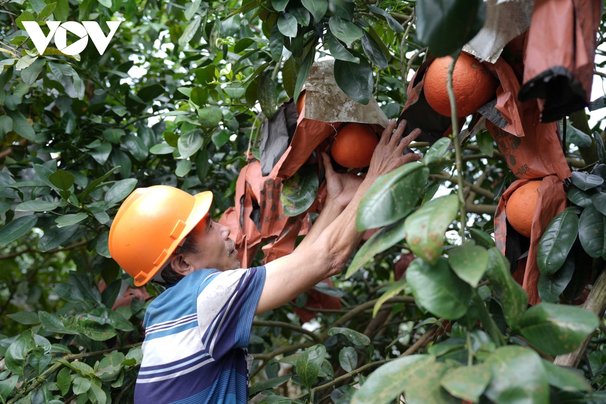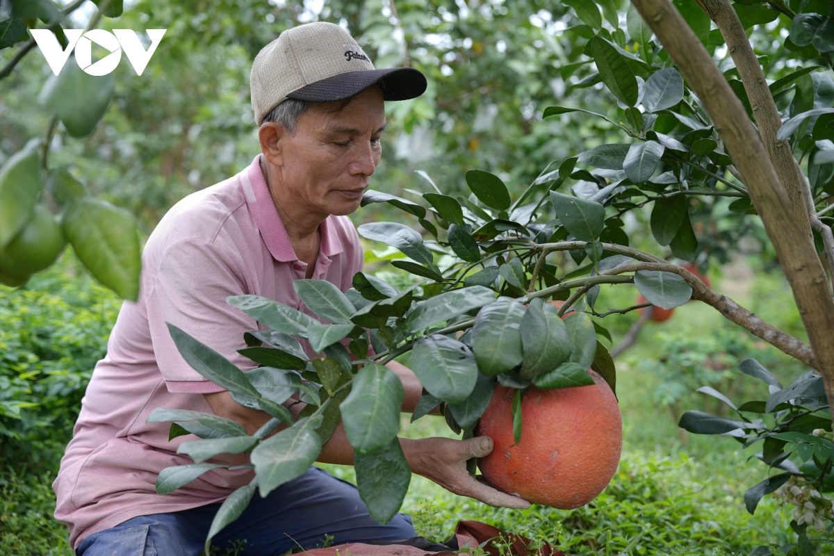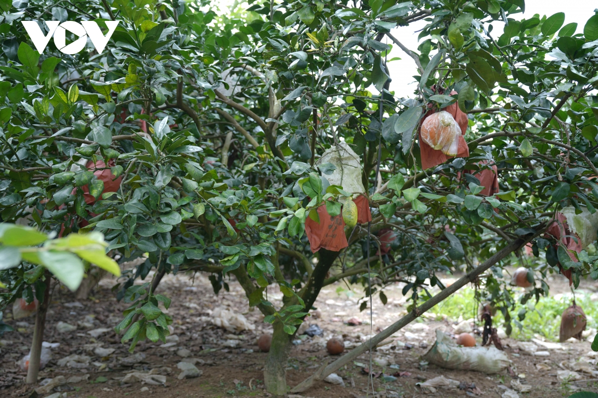 Giữa bức tranh nhiều gam màu xám ấy, vẫn có những điểm sáng hiếm hoi. Gia đình anh Nguyễn Văn Tư, ở làng Thủ Trinh, xã Lam Sơn, là một trong số ít những hộ còn giữ được vườn bưởi sau bão nhờ địa thế đất cao và hệ thống thoát nước tốt.