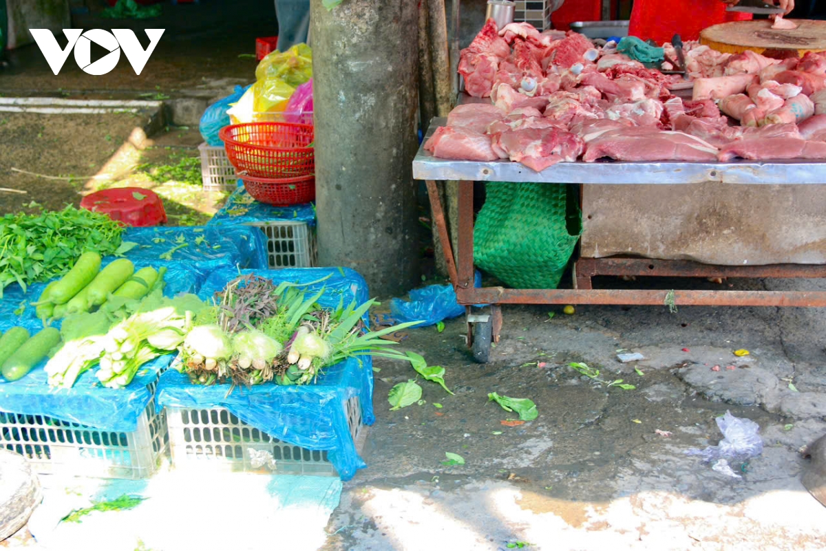 Mặt hàng chính trong chợ là rau, thịt, cá.