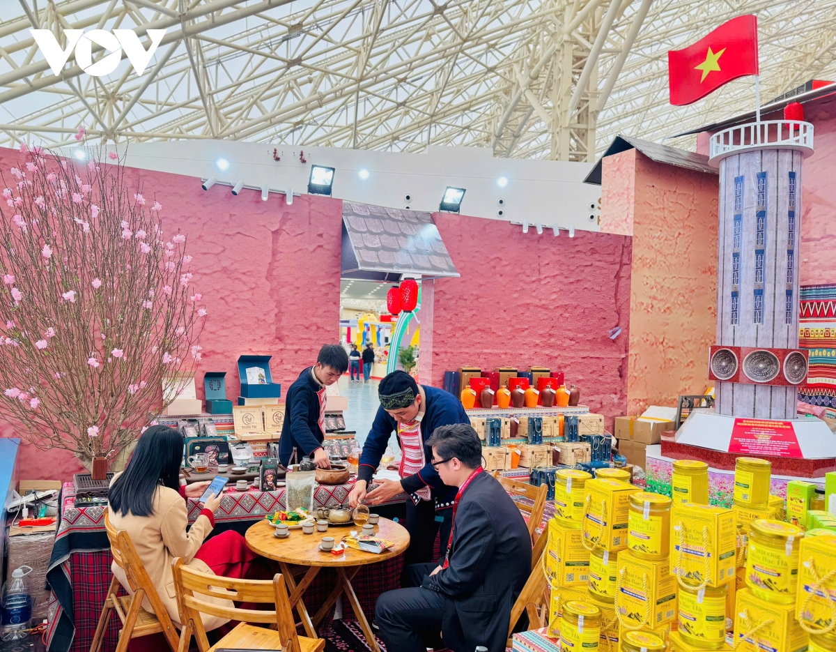 Điểm nhấn trong ngày 12/2 là hoạt động thưởng trà miễn phí tại Không gian trưng bày tỉnh Tuyên Quang. Đây là một trong những khu vực được đầu tư công phu, kết hợp hài hòa giữa yếu tố hiện đại và bản sắc văn hóa các dân tộc; lấy điểm nhấn là mô hình Cột cờ Lũng Cú. Bên cạnh việc trưng bày sản phẩm, gian hàng còn tích hợp trình chiếu video quảng bá, giới thiệu tiềm năng công nghiệp, thương mại, du lịch và môi trường đầu tư của tỉnh.