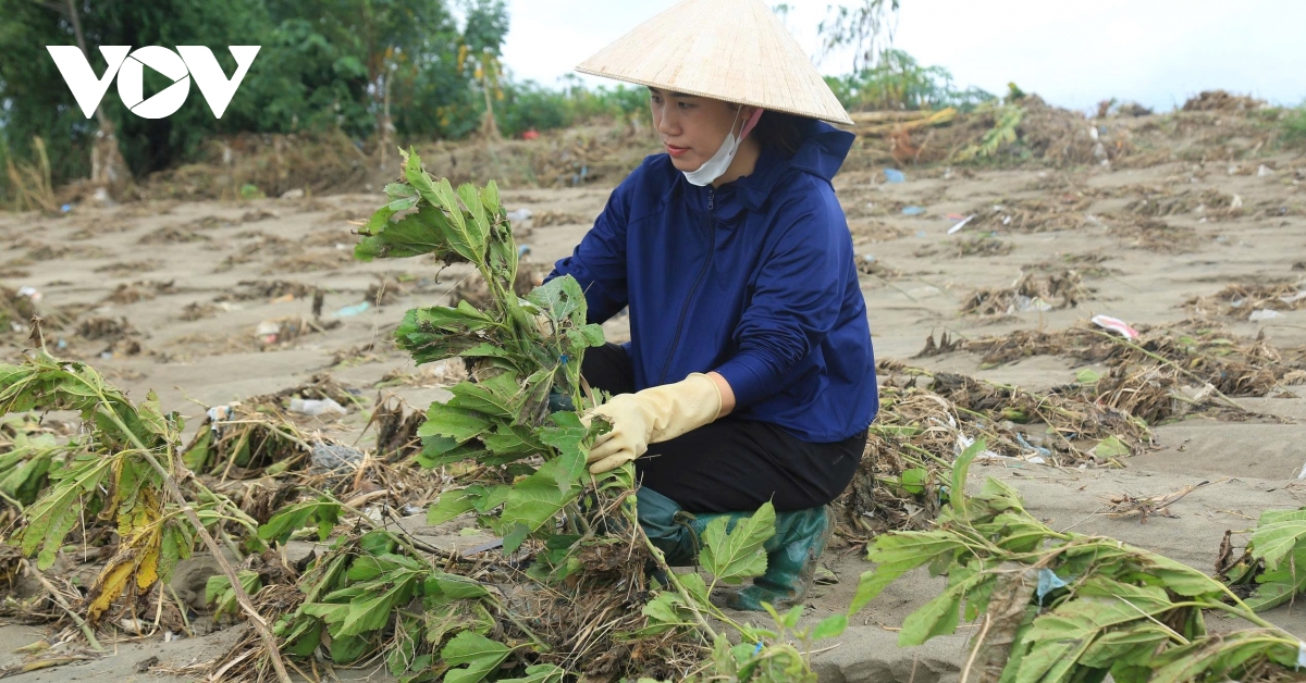Cánh đồng dâu xanh mướt rộng 25 ha của HTX dâu tằm Minh Tiến (xã Quy Mông) trải dài ven sông Hồng chỉ còn lại một màu nâu xám của bùn đất. Chị Nguyễn Thu Hương, Giám đốc HTX cho biết, cả một vùng dâu rộng lớn là hi vọng của bao gia đình ngã rạp, vùi dưới lớp bùn pha cát dày đặc, có nơi lên đến 1,5 mét.