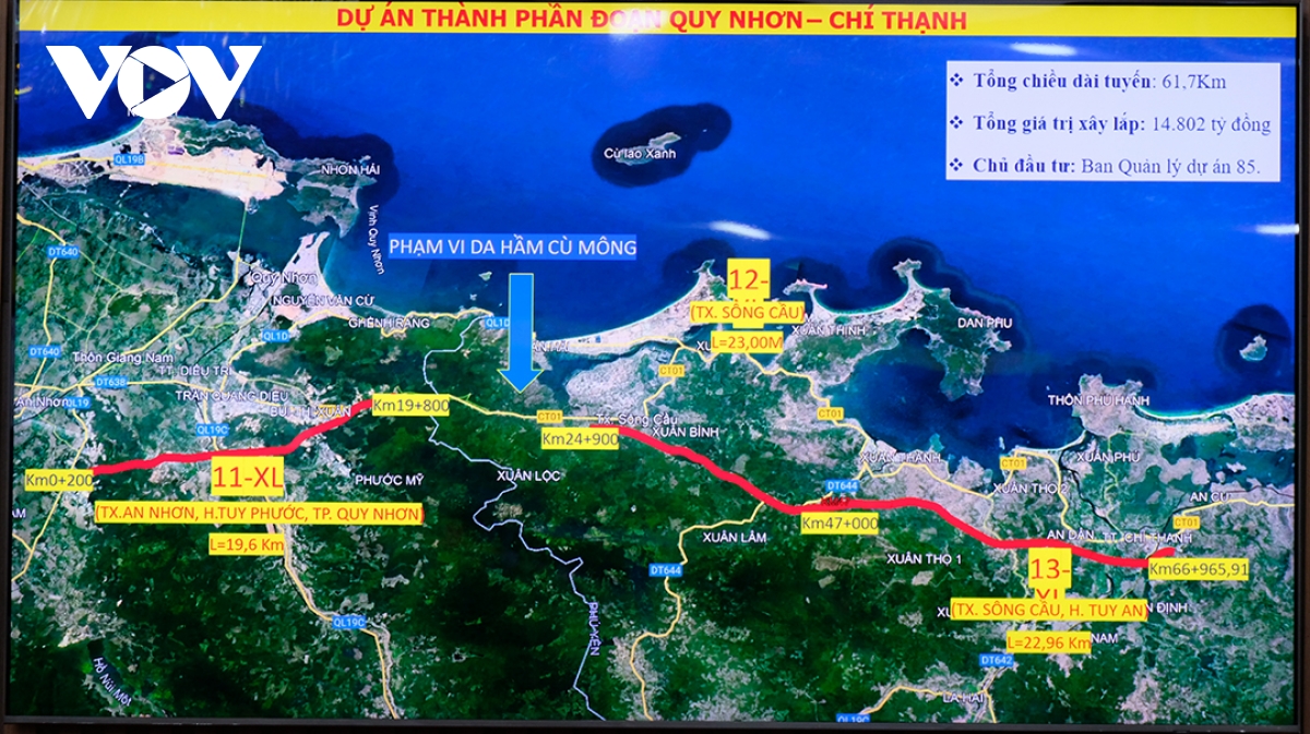 Dự án thành phần đoạn Quy Nhơn - Chí Thạnh có chiều dài 61,7 km, trong đó đoạn qua tỉnh Bình Định là 19,6 km và qua tỉnh Phú Yên là 42,1 km, do Ban Quản lý dự án 85 làm chủ đầu tư, với tổng mức đầu tư hơn 14.800 tỷ đồng; dự án khởi công ngày 1/1/2023, ngày hoàn thành theo hợp đồng là 14/12/2025, dự kiến rút ngắn ngày 30/9/2025. Dự án đã bàn giao mặt bằng đạt 100%, các nhà thầu đã tiếp cận để thi công toàn bộ phần tuyến chính. Đến thời điểm này, các dự án cơ bản đáp ứng tiến độ, công tác giải phóng mặt bằng cũng cơ bản hoàn thành. Các vướng mắc về vật liệu, nhất là đất đắp nền và đá vật liệu còn gặp một số khó khăn. Riêng dự án Hòa Liên- Túy Loan vẫn còn vướng về 0,1 km tuyến chính và 0,7 km đường gom chưa bàn giao mặt bằng cho nhà thầu. Tháng 3 này, thành phố Đà Nẵng sẽ khởi công khu tái định cư số 1; 2 khu tái định cư còn lại sẽ khởi công trong tháng 6 và sẽ không làm ảnh hưởng đến tiến độ giải phóng mặt bằng.