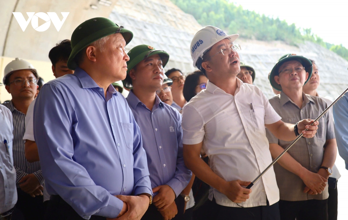 Nhà thầu thi công hầm Sơn Triệu, thuộc dự án thành phần đoạn Quy Nhơn - Chí Thạnh báo cáo tiến độ công trình với Phó Thủ tướng Thường trực Chính phủ Nguyễn Hòa Bình