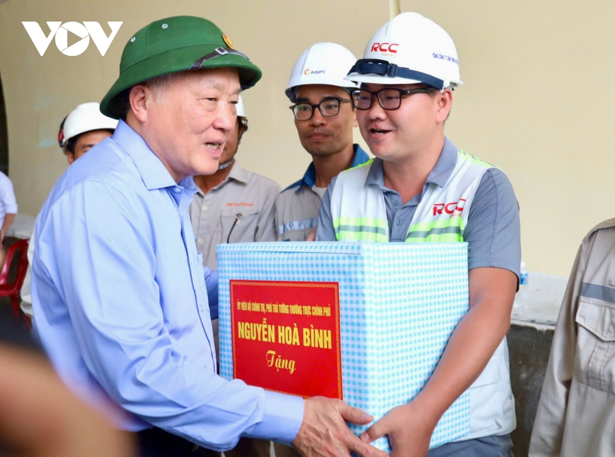 Phó Thủ tướng Thường trực Chính phủ Nguyễn Hòa Bình tặng quà công nhân thi công cao tốc