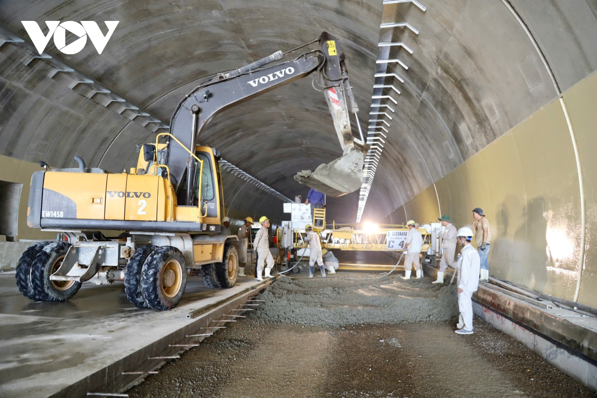 Công nhân đổ bê tông nền trong hầm Sơn Triệu