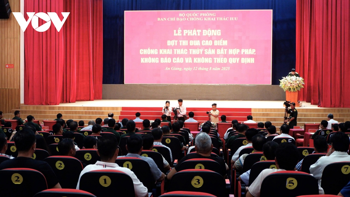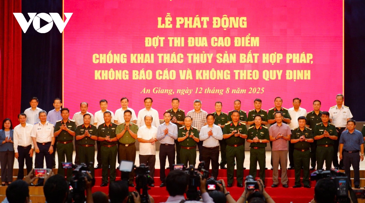 VOV.VN - Sáng 12/8, tại An Giang, Bộ Quốc phòng phối hợp với UBND tỉnh An Giang tổ chức lễ phát động đợt cao điểm thi đua chống khai thác thuỷ sản bất hợp pháp, không báo cáo và không theo quy định. Thời gian thi đua bắt đầu từ ngày 12/8/2025 đến ngày 02/9/2025.