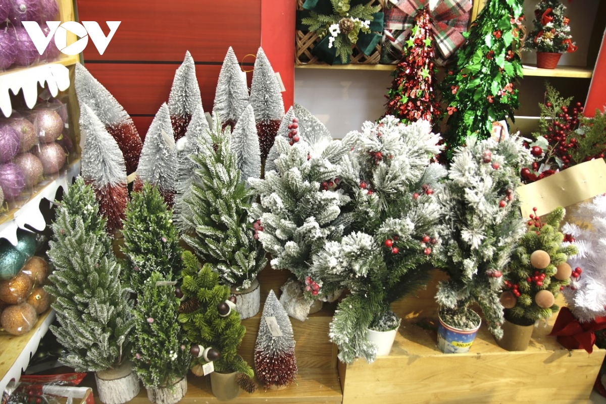 Để tăng thêm vẻ lung linh cho cây thông, các loại phụ kiện như trái châu, dây kim tuyến, nơ, gậy kẹo, kẹo mút cũng được bày bán phong phú. Trái châu bằng nhựa có giá khoảng 260.000 đồng/hộp 20 trái; loại làm từ nhung, trang trí cầu kỳ có giá cao hơn, khoảng 70.000 đồng/trái. Các sản phẩm trang trí khác như ông già Noel leo dây, ông già Noel có đèn, nhạc có giá khoảng 150.000 đồng/sản phẩm; nón, vớ, chuông, chữ trang trí… có giá từ 25.000 đồng trở lên.
