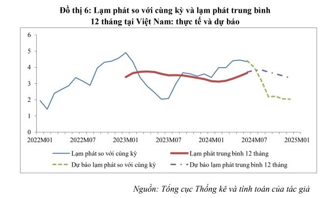 Dự báo diễn biến nửa cuối năm 2024, Phó Viện trưởng Viện Kinh tế - Tài chính đưa ra 3 kịch bản. Theo đó, ở kịch bản cao, giá dầu tăng nhẹ, tỷ giá ổn định, CPI tăng trung bình 0,23%/tháng trong 6 tháng cuối năm 2024 (tương đương mức tăng trong 6 tháng đầu năm 2024). Lúc đó, lạm phát so với cùng kỳ vào tháng 12/2024 sẽ ở mức 2,8% và lạm phát trung bình cả năm 2024 sẽ ở mức 3,6%.
