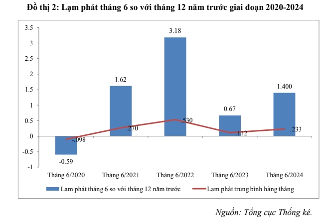 Theo số liệu của Tổng cục Thống kê công bố mới đây, chỉ số giá tiêu dùng (CPI) tháng 6/2024 tăng 0,17% so với tháng trước. So với tháng 12/2023 CPI tháng 6/2024 tăng 1,4% và so với cùng kỳ năm trước tăng 4,34%. CPI bình quân quý 2/2024 tăng 4,39% so với cùng kỳ năm trước. Tính chung 6 tháng đầu năm 2024, CPI tăng 4,08% so với cùng kỳ năm trước; lạm phát cơ bản tăng 2,75%.