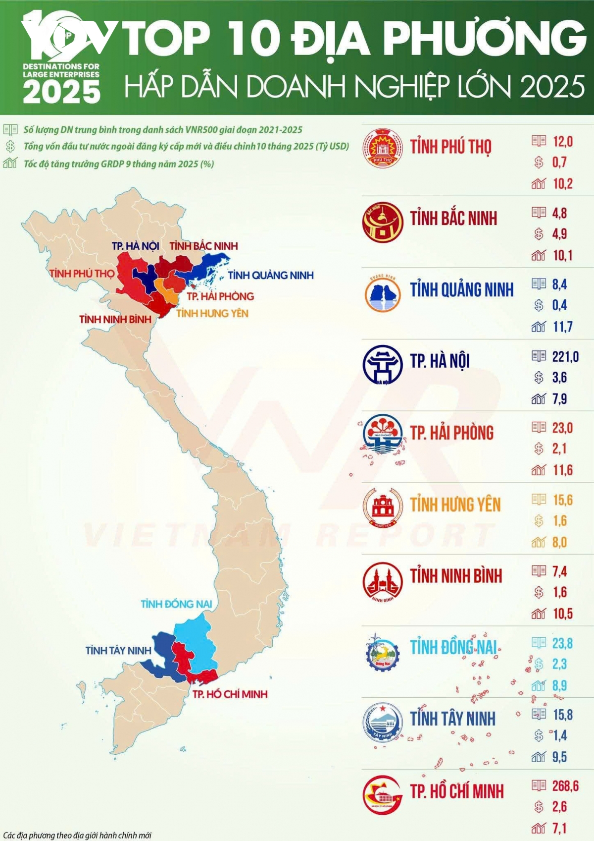 Được xây dựng và công bố suốt gần 20 năm qua, Bảng xếp hạng VNR500 của VietNamNet và Vietnam Report là hệ thống xếp hạng thường niên uy tín, cung cấp dữ liệu khách quan phục vụ hoạch định chính sách và chiến lược phát triển doanh nghiệp. Việc bình chọn Top 10 địa phương hấp dẫn doanh nghiệp lớn nhằm ghi nhận những địa phương có môi trường kinh doanh thuận lợi, năng lực điều hành nổi trội và đóng góp quan trọng cho tăng trưởng kinh tế.