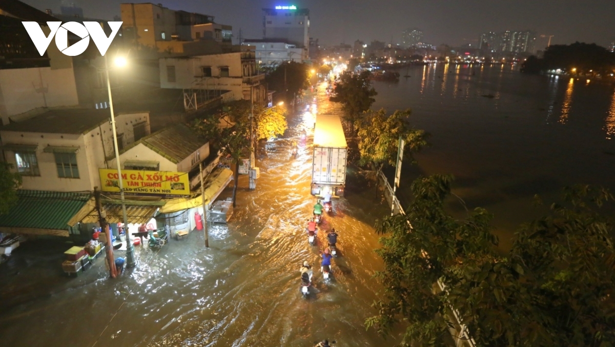 Những ngày triều cường, con đường Trần Xuân Soạn (phường Tân Thuận) hay nhiều tuyến đường khác ở khu vực phía Nam TP.HCM như: Lê Văn Lương, Huỳnh Tấn Phát, Phạm Hữu Lầu, Đào Sư Tích... lại biến thành sông. Mọi hoạt động buôn bán, đi lại đều ngưng trệ.