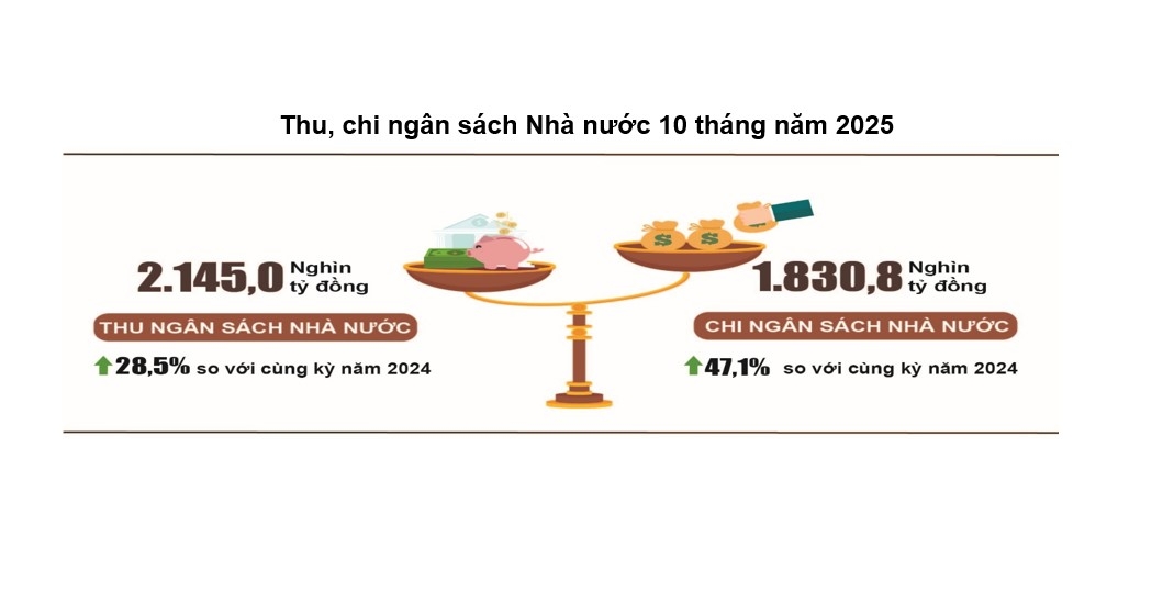 Tổng thu ngân sách Nhà nước tháng 10 ước đạt 193.500 tỷ đồng, lũy kế tổng thu ngân sách Nhà nước 10 tháng năm 2025 đạt 2.145,0 nghìn tỷ đồng, bằng 109,1% dự toán năm và tăng 28,5% so với cùng kỳ năm trước.