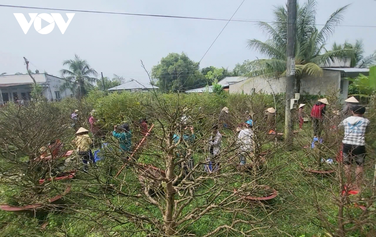 Chủ vườn mai mướn vài nhân công để lặt lá mai
