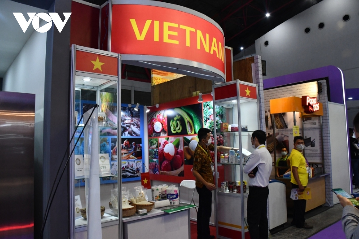 Tham dự Triển lãm quốc tế về thực phẩm và đồ uống 2022 tại Jakarta, Gian hàng Việt Nam giới thiệu các sản phẩm như gạo, cà phê, chè, sữa…. thu hút sự quan tâm của khách tham quan.