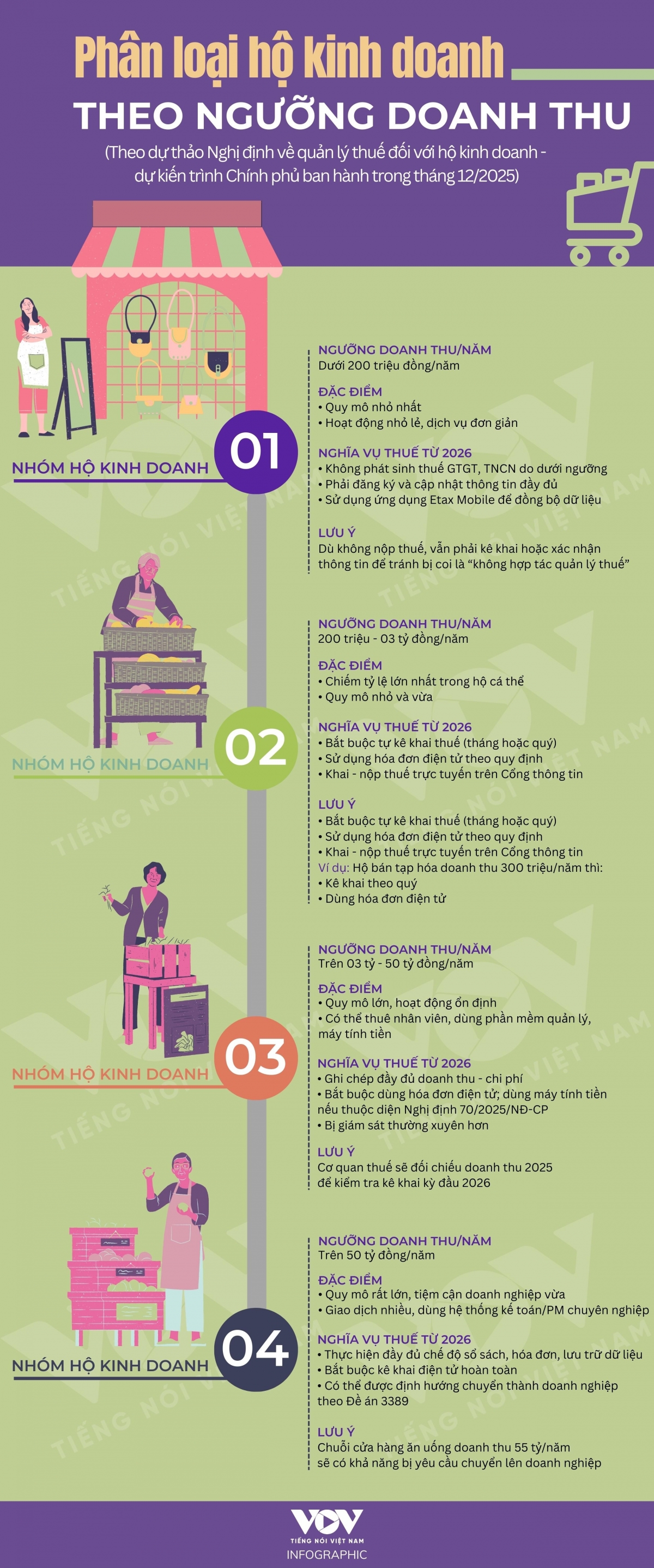VOV.VN - Từ ngày 1/1/2026, cơ chế thuế khoán chính thức kết thúc, toàn bộ hộ kinh doanh phải chuyển sang tự kê khai thuế theo doanh thu thực tế. Để thực hiện kê khai đúng quy định, hộ kinh doanh từ năm 2026 sẽ được phân loại theo quy mô doanh thu.