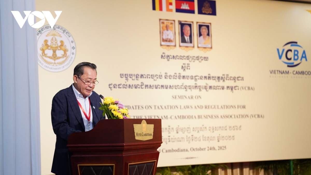 VOV.VN - Hôm nay (24/10), tại thủ đô Phnom Penh, Hiệp hội Doanh nghiệp Việt Nam - Campuchia (VCBA) phối hợp với Tổng cục Thuế Campuchia đã tổ chức Hội thảo “Cập nhật Luật và Văn bản Quy phạm pháp luật của Campuchia về thuế và nghĩa vụ thuế đến các hội viên hiệp hội doanh nghiệp Việt Nam tại Campuchia.