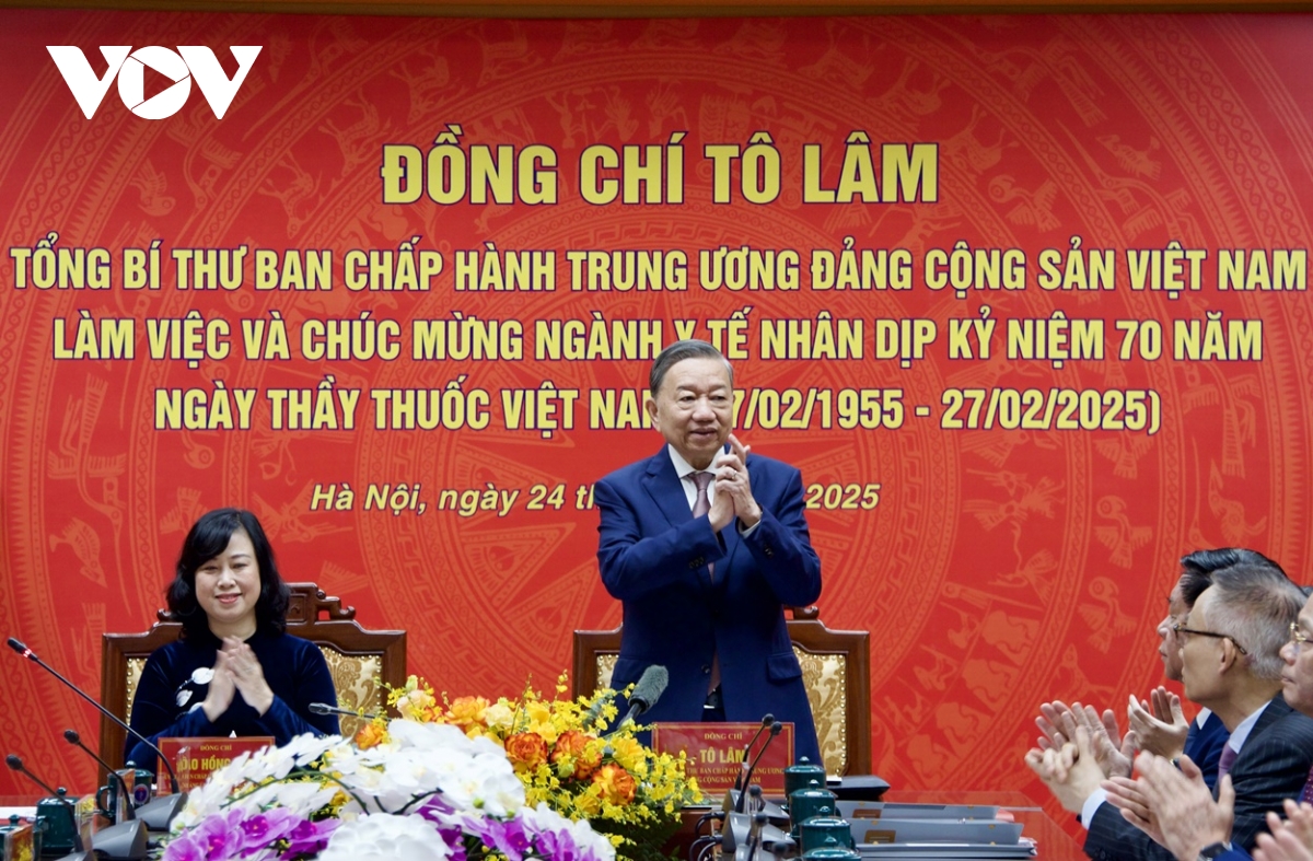 VOV.VN - Sáng nay 24/2, tại Hà Nội, Tổng Bí thư Tô Lâm tới thăm và chủ trì buổi làm việc với Bộ Y tế và chúc mừng Ngành Y tế nhân dịp kỉ niệm 70 năm Ngày Thầy thuốc Việt Nam (27/2/1955 - 27/2/2025).