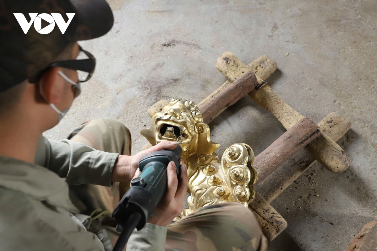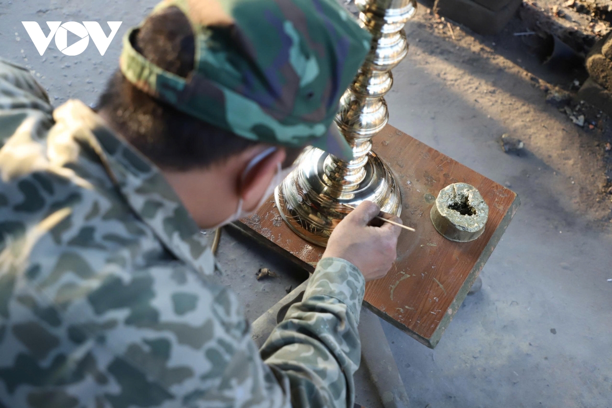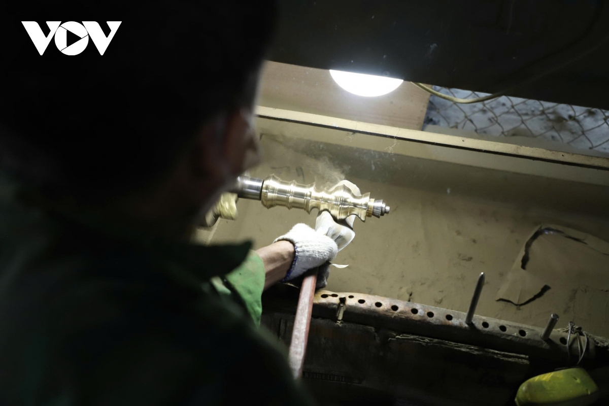 Sản phẩm được đánh bóng thủ công bằng dụng cụ và vật liệu chuyên dụng, giúp làm sạch bề mặt, làm nổi màu đồng tự nhiên và tôn lên các đường nét, hoa văn tinh xảo. Công đoạn này đòi hỏi sự khéo léo và kinh nghiệm của người thợ để sản phẩm đạt độ sáng hài hòa, bền màu và hoàn thiện giá trị thẩm mỹ.