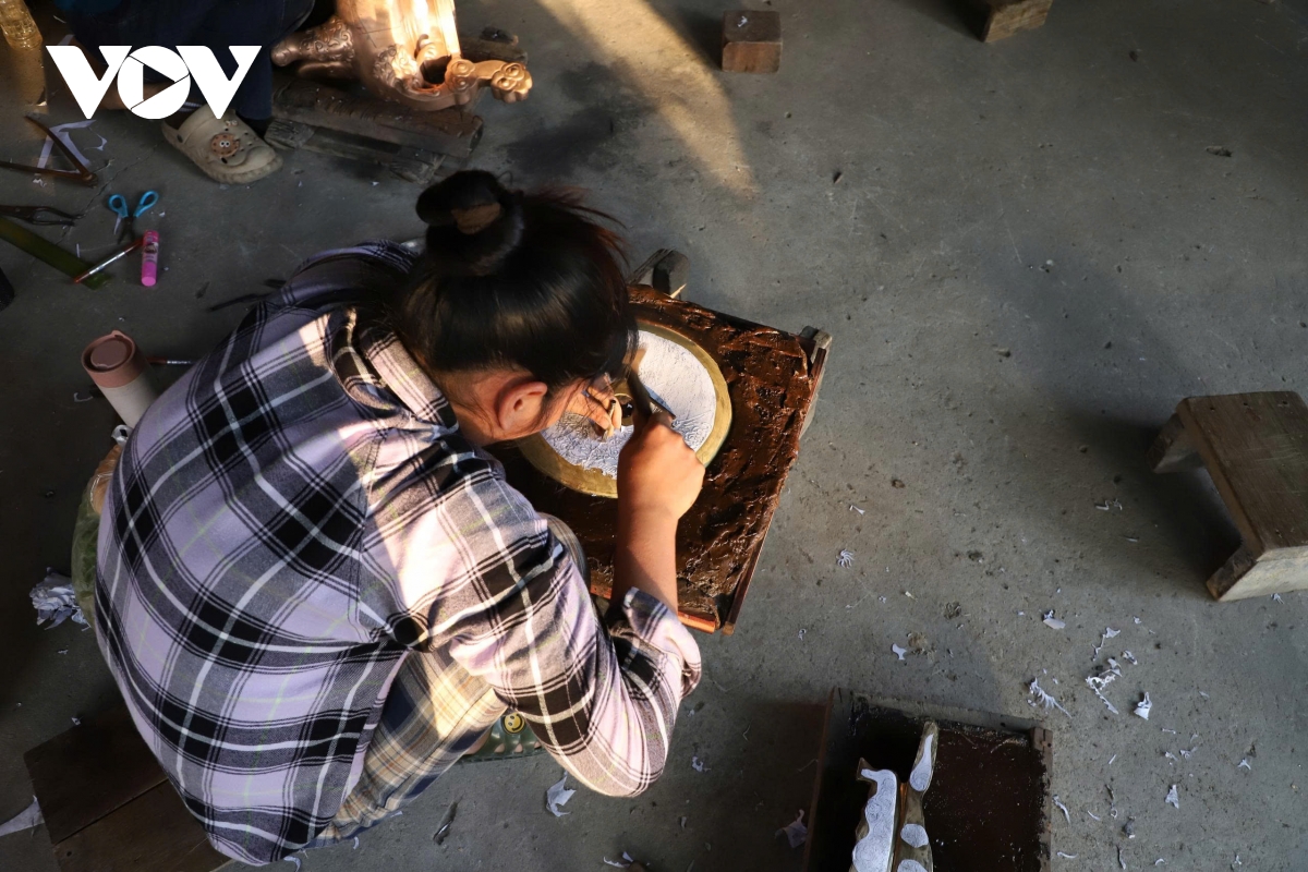 Sau khi đánh bóng, để làm nổi bật các đường nét hoa văn chạm khắc, người thợ sử dụng bút sơn chuyên dụng tô đậm các chi tiết theo bố cục đã định. Công đoạn này giúp tạo độ tương phản, làm rõ chiều sâu hoa văn, đồng thời tăng tính thẩm mỹ và giá trị hoàn thiện cho sản phẩm đúc đồng.