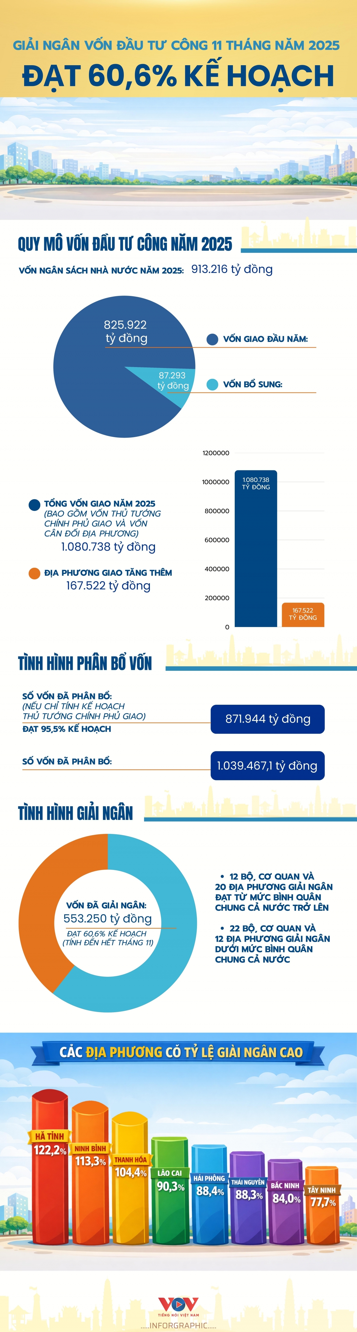 VOV.VN - Sau 11 tháng thực hiện, tổng vốn đầu tư công giải ngân đạt 553.250 tỷ đồng, đạt 60,6% kế hoạch. Như vậy, vẫn còn gần 360.000 tỷ đồng vốn đầu tư công đang “nằm chờ” được giải ngân.