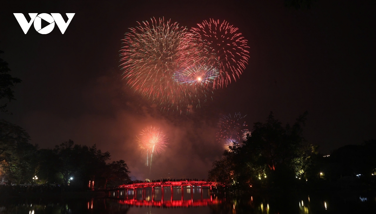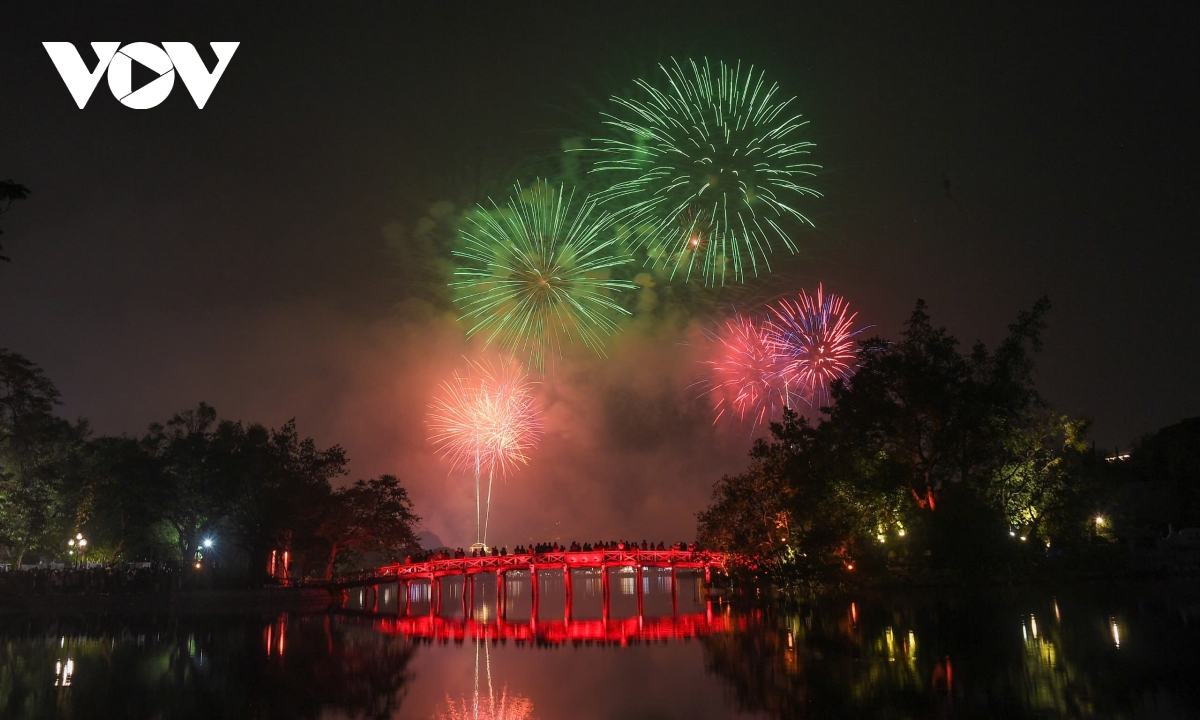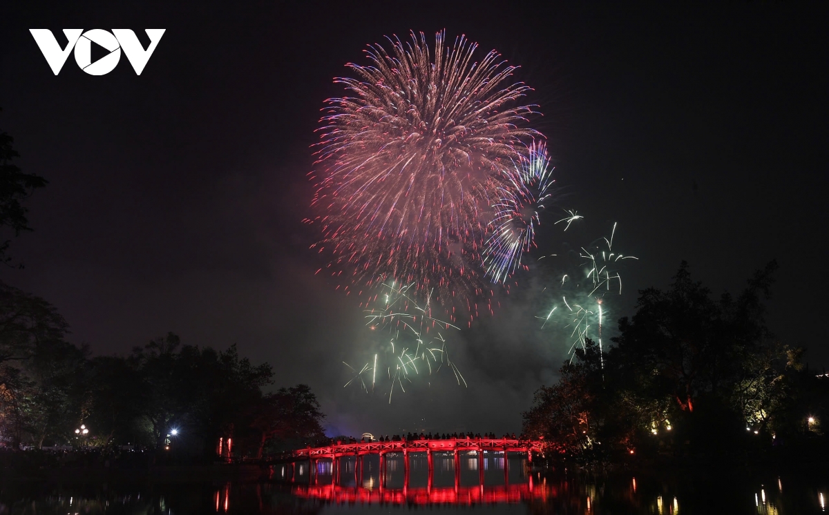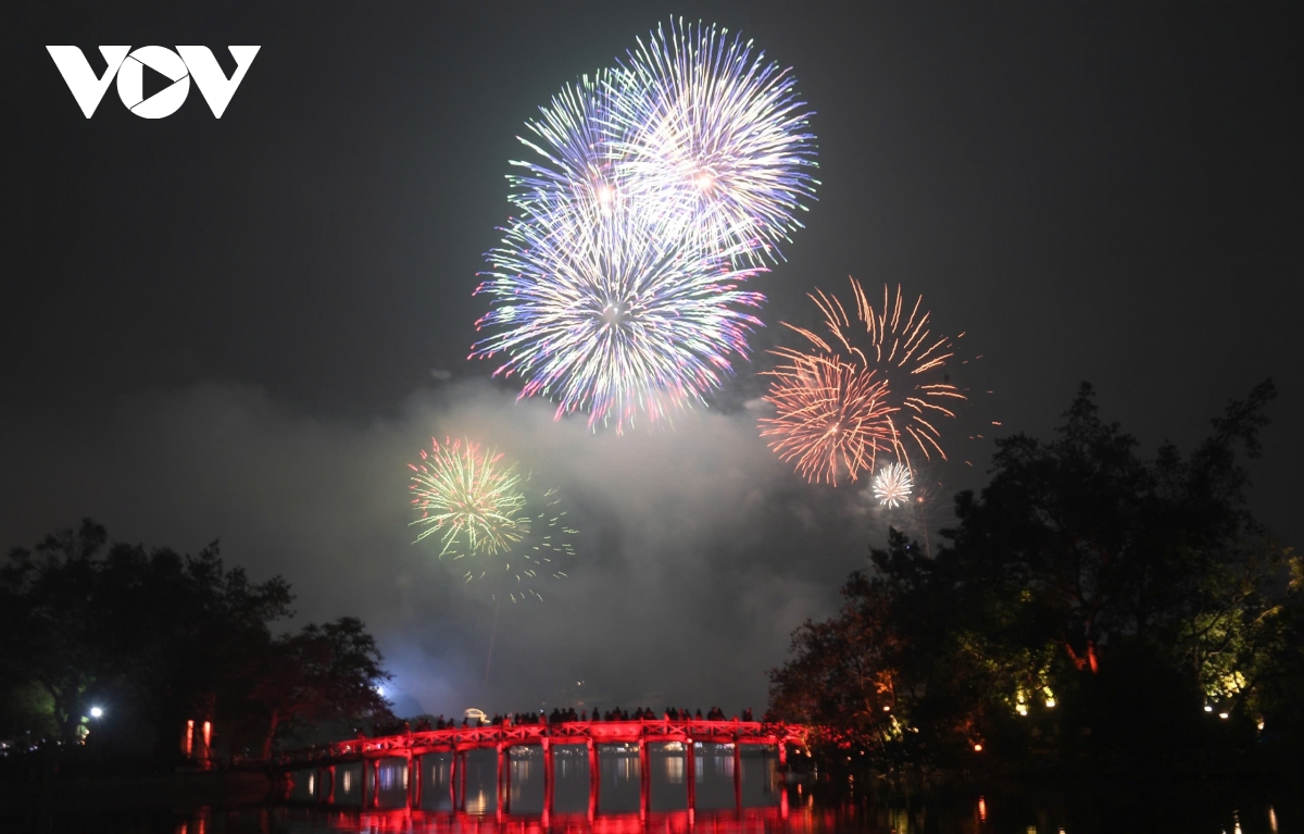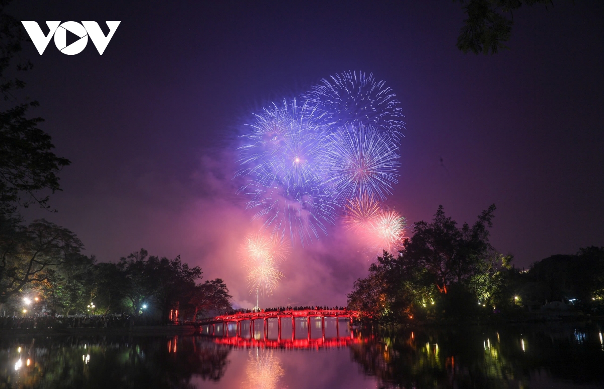Pháo hoa rực sáng trên cầu Thê Húc và mặt hồ Gươm.