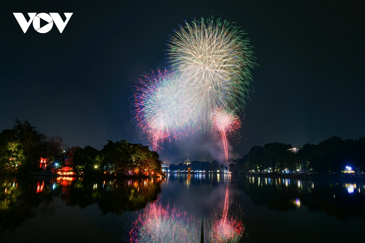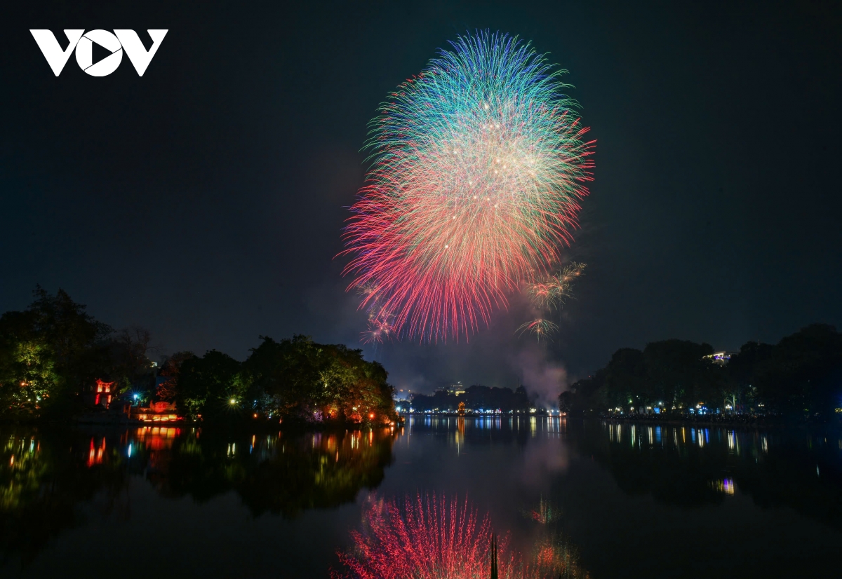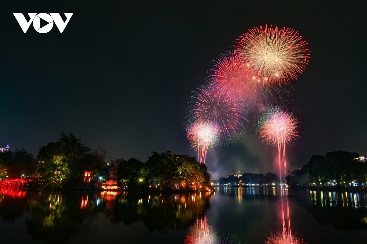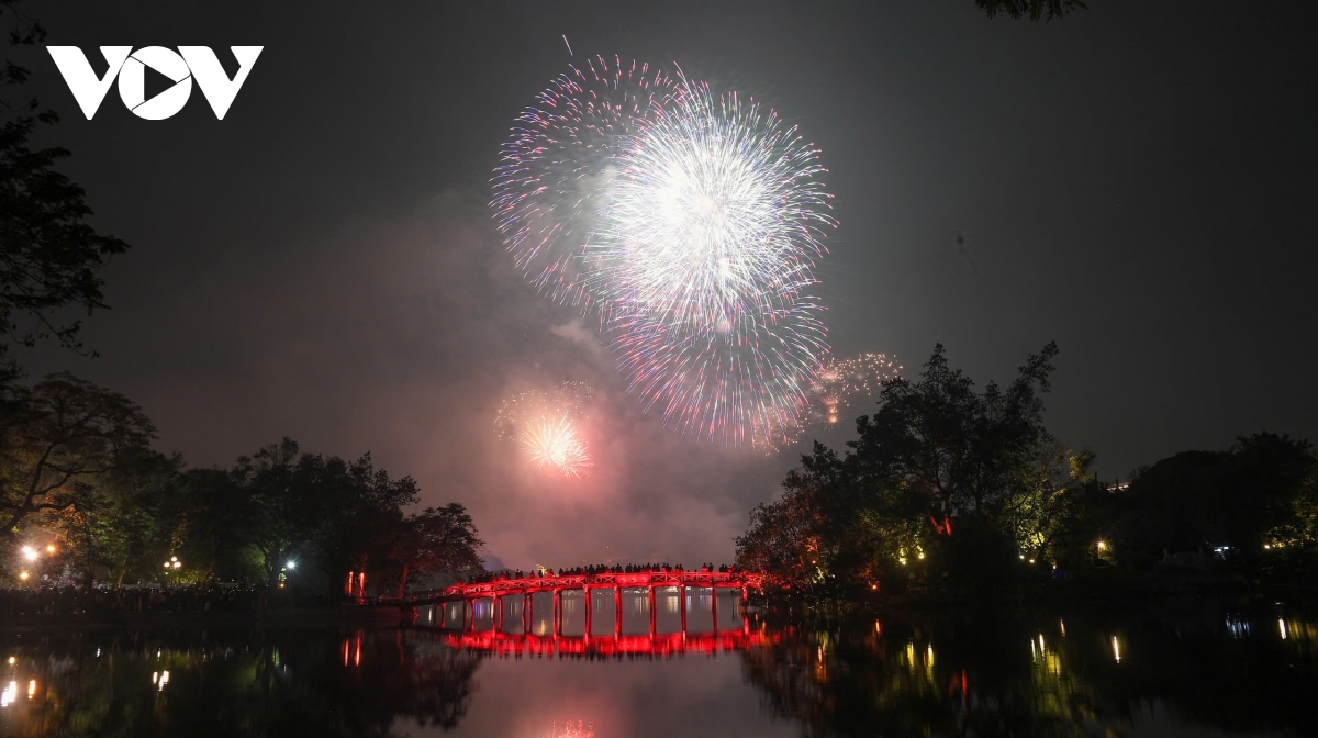 Pháo hoa rực sáng trên cầu Thê Húc và mặt hồ Gươm.