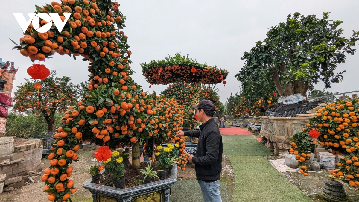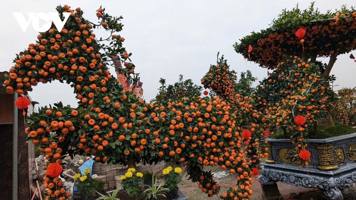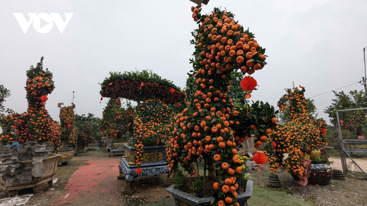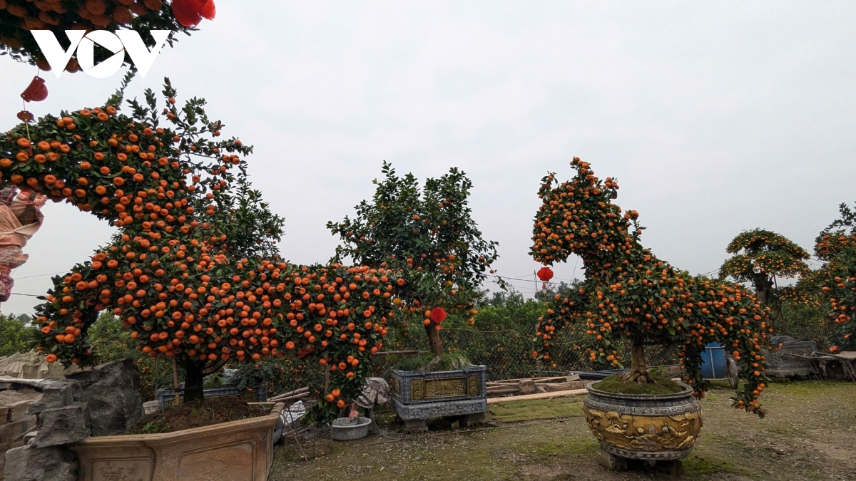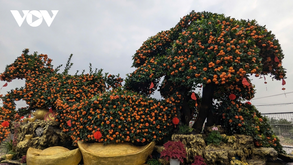 Theo ghi nhận của phóng viên VOV, tại nhiều nhà vườn ở xã Văn Giang (Hưng Yên), bên cạnh các gốc quất bonsai truyền thống, thị trường năm nay còn ghi nhận sự xuất hiện của nhiều cây quýt cổ thụ trĩu quả, được uốn nắn, tạo dáng công phu, mang đến diện mạo mới lạ và bắt mắt.