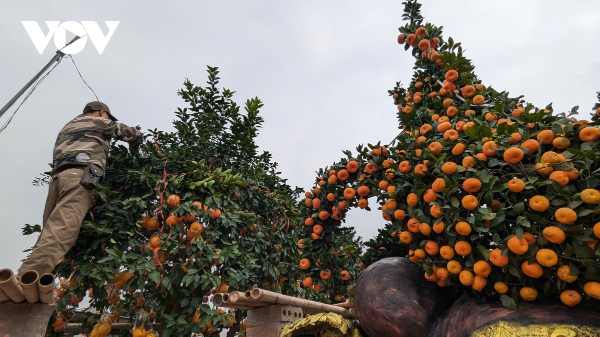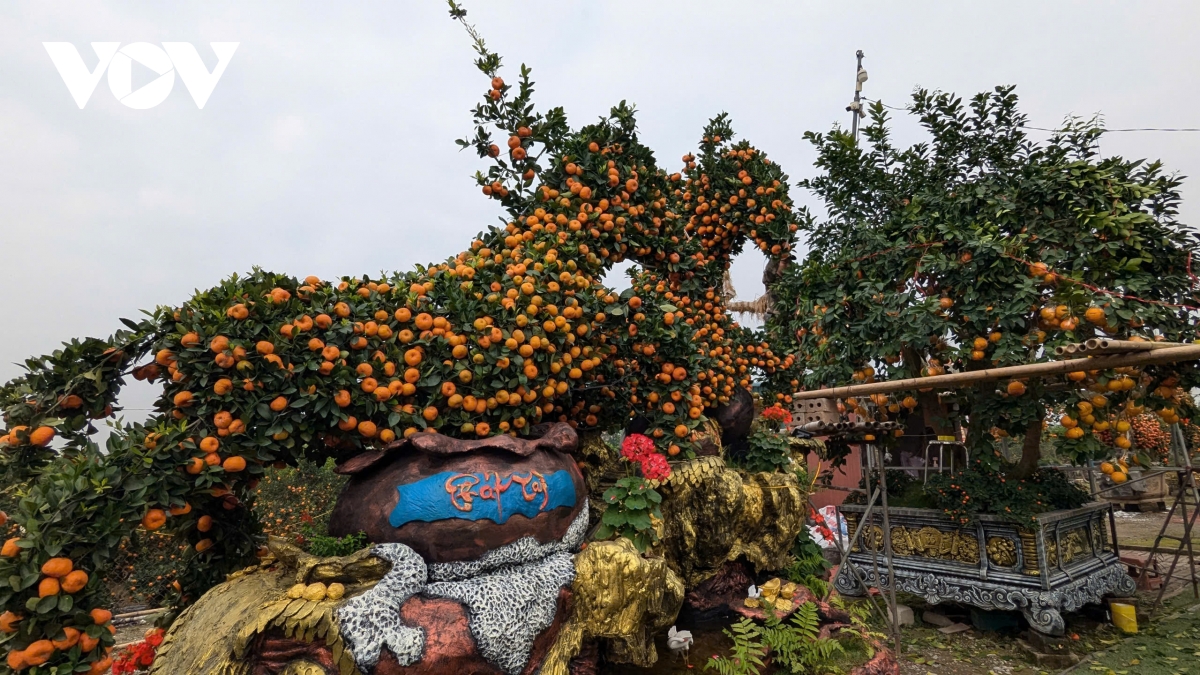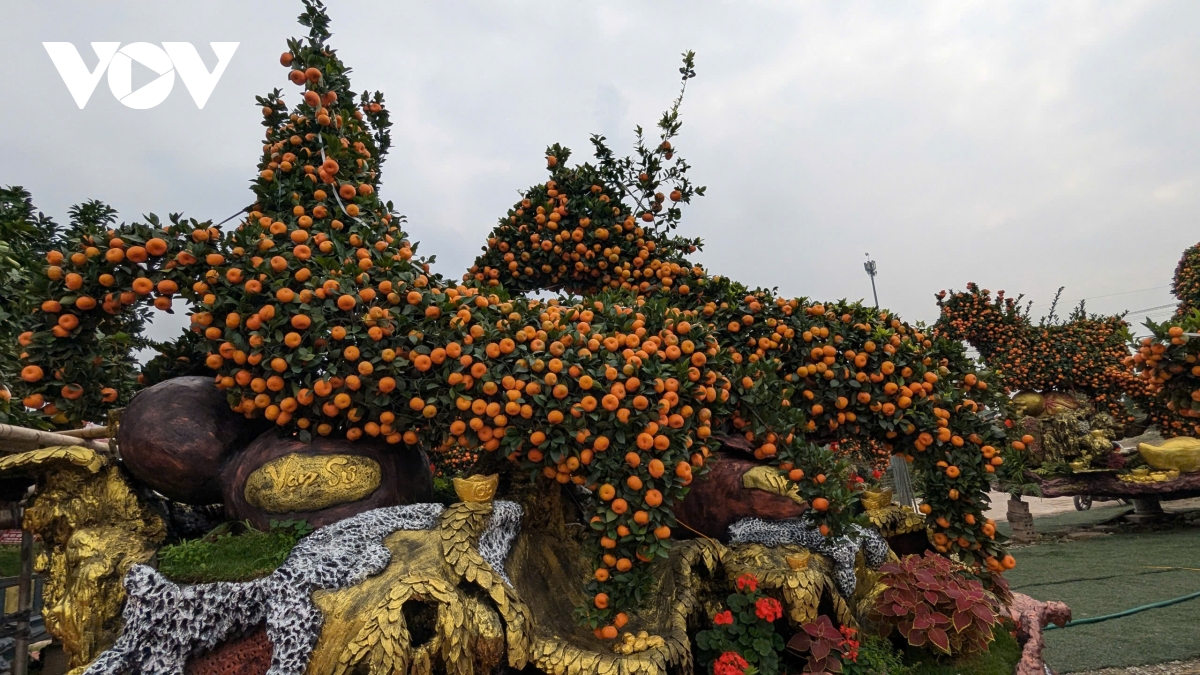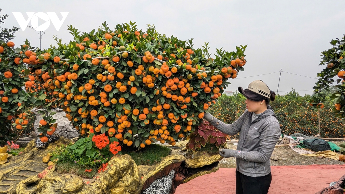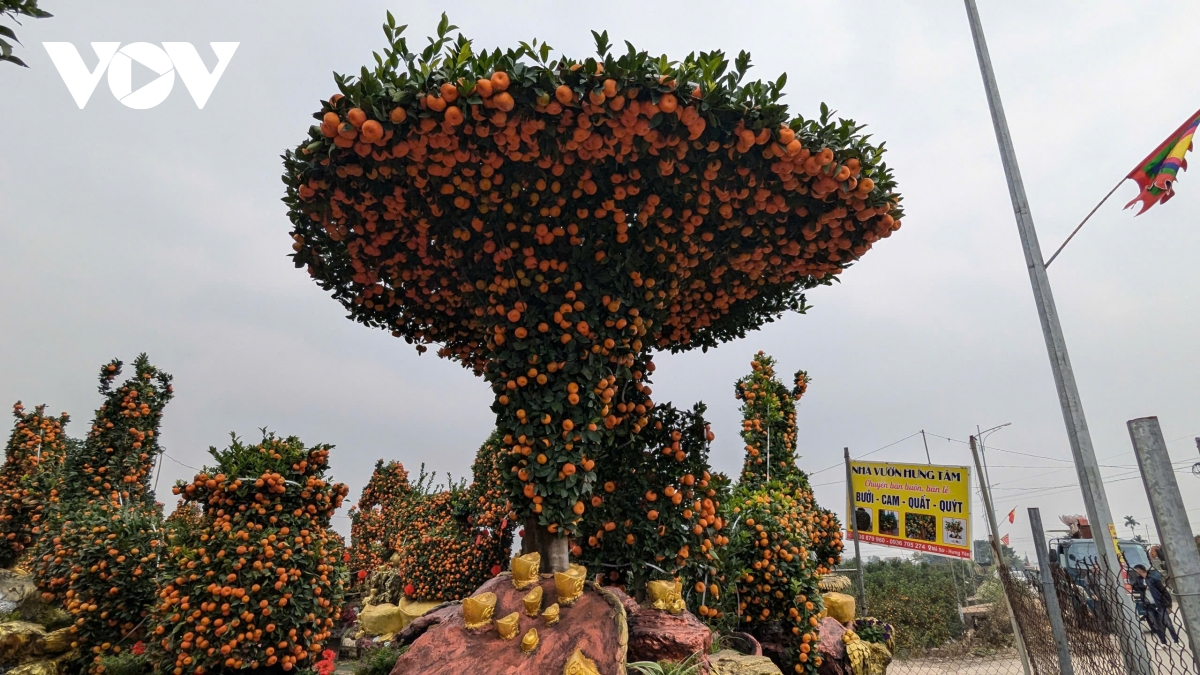 Theo ghi nhận của phóng viên VOV, tại nhiều nhà vườn ở xã Văn Giang (Hưng Yên), bên cạnh các gốc quất bonsai truyền thống, thị trường năm nay còn ghi nhận sự xuất hiện của nhiều cây quýt cổ thụ trĩu quả, được uốn nắn, tạo dáng công phu, mang đến diện mạo mới lạ và bắt mắt.