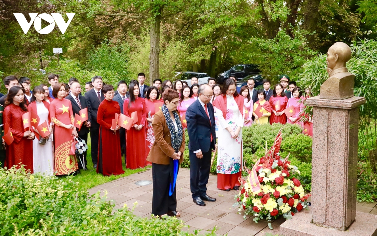 Trước đó, Đại sứ Đinh Toàn Thắng và toàn thể các cán bộ cùng phu quân, phu nhân đã long trọng tổ chức lễ dâng hương tưởng nhớ Chủ tịch Hồ Chí Minh tại bàn thờ Bác Hồ trong khuôn viên trụ sở Đại sứ quán Việt Nam ở thủ đô Paris.