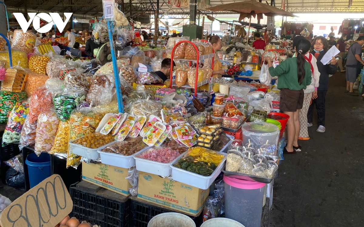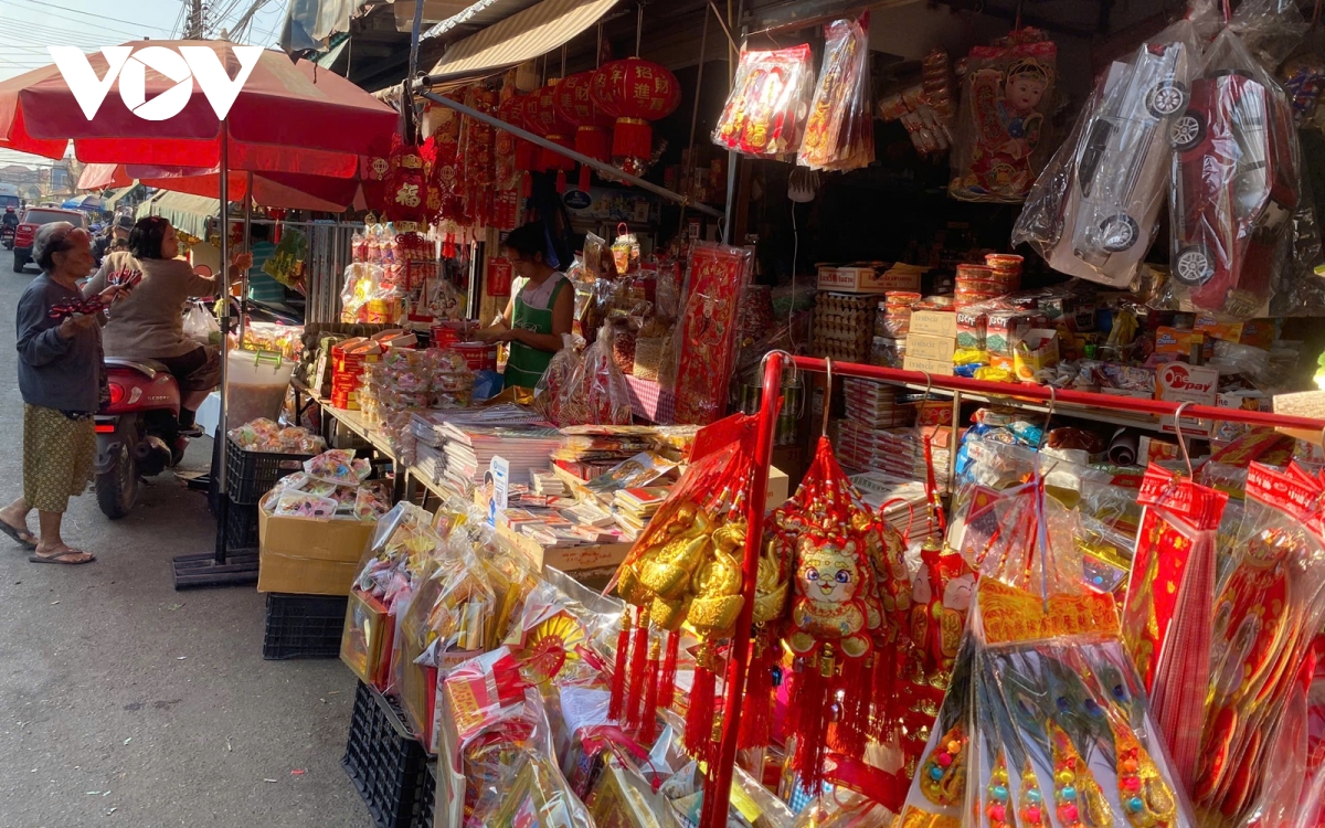 Tuy không sầm uất như phố Hàng Mã ở Hà Nội, nhưng hàng Tết năm nay ở chợ Thongkhankham rất phong phú và đa dạng, từ thực phẩm, nguyên liệu làm bánh, kẹo mứt truyền thống, đến hương đèn, vàng mã, đồ trang trí.... hàng hóa Tết không thiếu một thứ gì. Các quầy hàng Việt luôn tấp nập khách mua, người Việt mua, người Lào cũng mua.