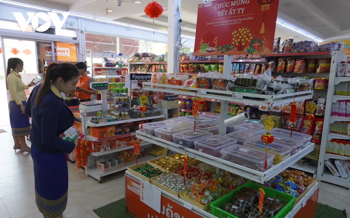 Tại hệ thống siêu thị Vimart, các nhu yếu phẩm, thực phẩm phục vụ dịp Tết được trưng bày trên kệ ở những vị trí trung tâm, sẵn sàng đáp ứng nhu cầu mua sắm tăng cao của cộng đồng người Việt cũng như giúp người Lào trải nghiệm về văn hóa ẩm thực của Tết Việt.