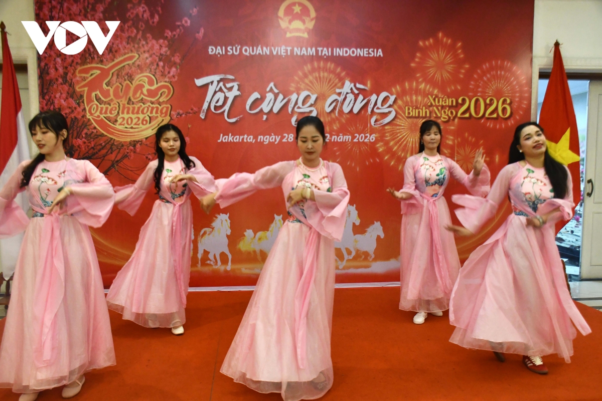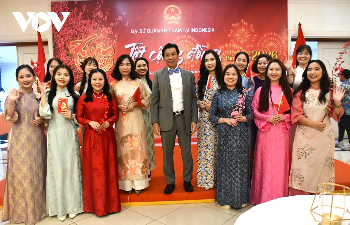 VOV.VN - Trong không khí ấm áp đầu xuân, tối 28/2, Đại sứ quán Việt Nam tại Indonesia tổ chức Tết Cộng đồng – chào xuân Bính Ngọ 2026. Chương trình có sự tham dự của cán bộ, nhân viên các cơ quan đại diện Việt Nam và đông đảo bà con kiều bào đang sinh sống, làm việc tại Indonesia.
