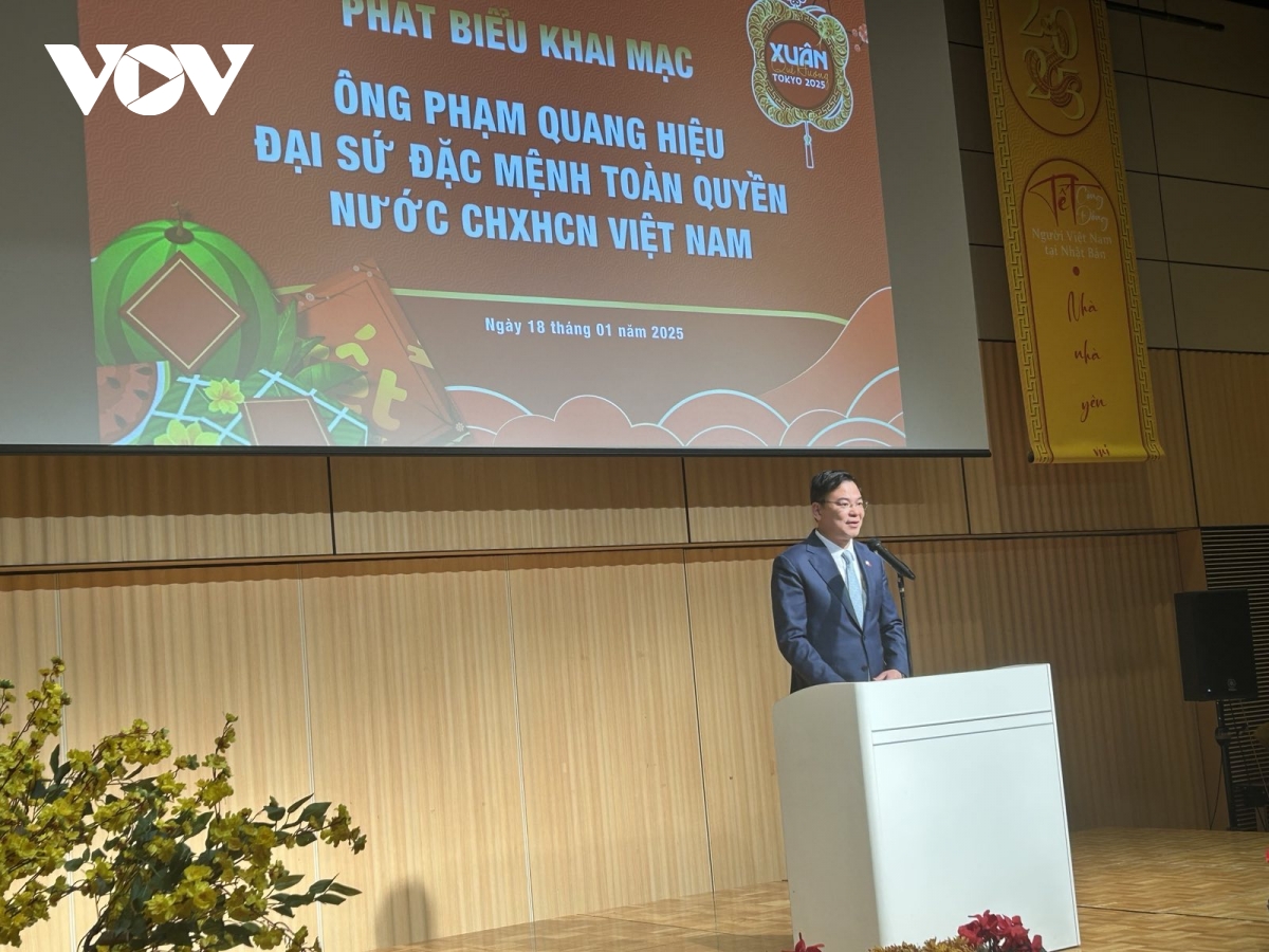 VOV.VN - Hòa cùng không khí đón xuân của cả dân tộc, chiều 18/1, tại thủ đô Tokyo, chương trình Xuân Quê hương 2025 do Đại sứ quán Việt Nam tại Nhật Bản chủ trì đã diễn ra với một không gian lễ hội từng bừng, tạo điểm nhấn cho các hoạt động chào mừng Tết Nguyên đán Ất Tỵ của Cộng đồng.
