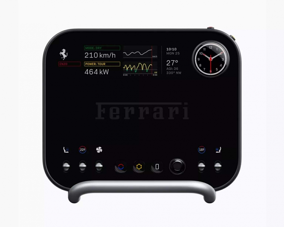 Khu vực trung tâm còn có thể chỉnh góc nghiêng màn hình thông qua tay nắm bằng nhôm, giúp người lái dễ tương tác hơn mà không cần chạm vào màn hình. Nhiều chi tiết được lấy cảm hứng từ phi cơ và các thiết bị cổ điển, dù tổng thể vẫn giữ được nét hiện đại và sang trọng đặc trưng của Ferrari.