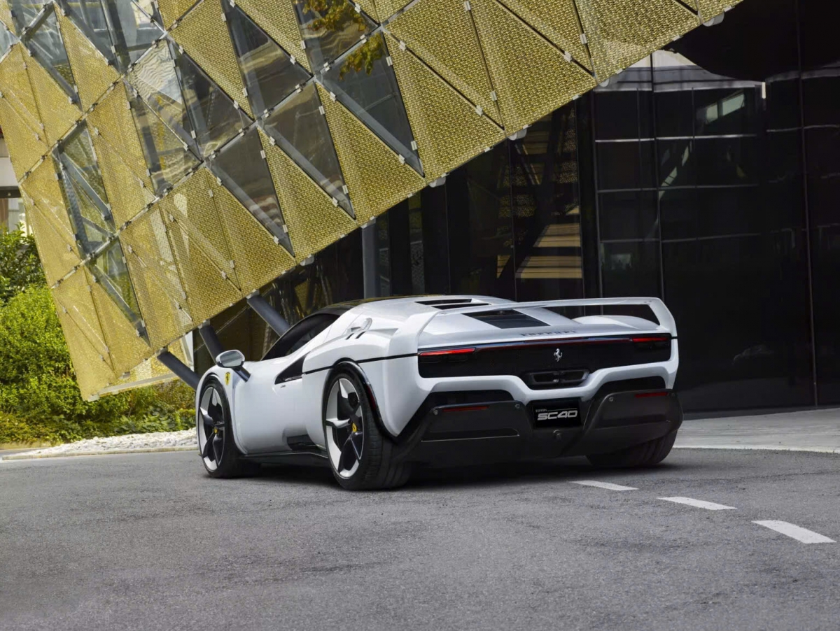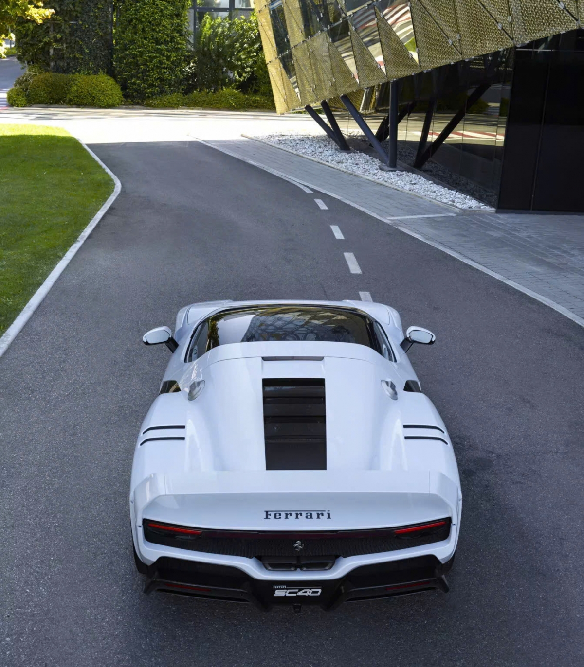 Ở hai bên thân, Ferrari SC40 tái hiện hệ thống ống dẫn khí NACA đặc trưng của F40, được hoàn thiện bằng sợi carbon và tạo điểm nhấn với đường gân mạnh mẽ ở phần hông sau. Cánh gió cố định biểu tượng của F40 cũng trở lại, dù được tinh chỉnh gọn gàng hơn. Phần đuôi xe nổi bật với các khe gió Lexan trên nắp động cơ và cụm đèn hậu mượn từ 296 GTB, mang lại vẻ hiện đại xen lẫn hoài cổ.
