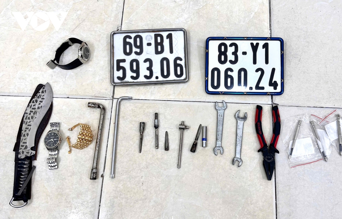Lực lượng Công an đã thu giữ nhiều tang vật gồm: 4 xe máy các loại, trong đó có 2 xe mang biển số giả; 2 biển số xe rời, 1 bộ dụng cụ mở khóa xe cùng nhiều tang vật khác có liên quan.