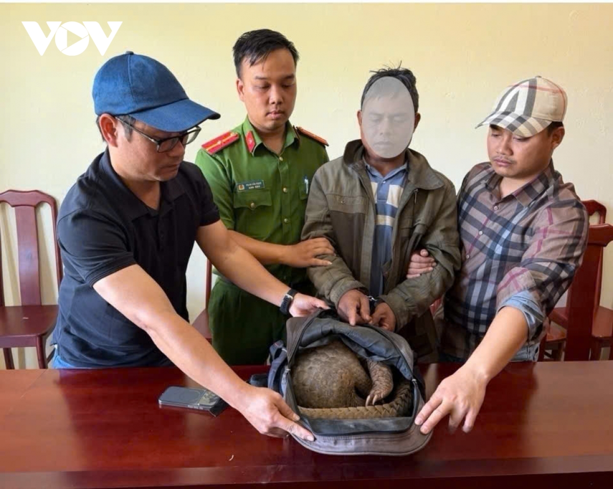Tiến hành kiểm tra, lực lượng chức năng phát hiện phía trước xe mô tô có một ba lô màu xám, bên trong chứa 01 động vật hoang dã còn sống, có bốn chi, toàn thân phủ vảy, nghi là tê tê.