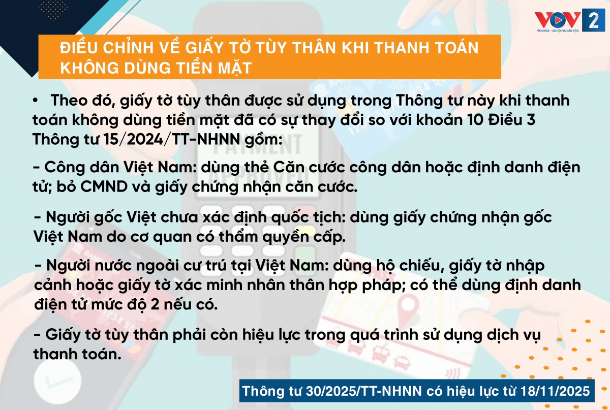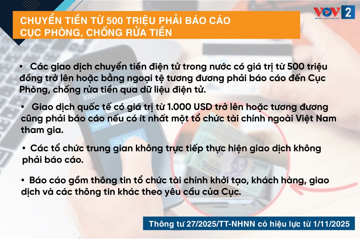 VOV.VN - Chuyển tiền từ 500 triệu phải báo cáo Cục Phòng, chống rửa tiền; Ngân hàng được giao, nhận vàng miếng; Điều chỉnh về giấy tờ tùy thân khi thanh toán không dùng tiền mặt… là những chính sách nổi bật có hiệu lực từ tháng 11/2025.