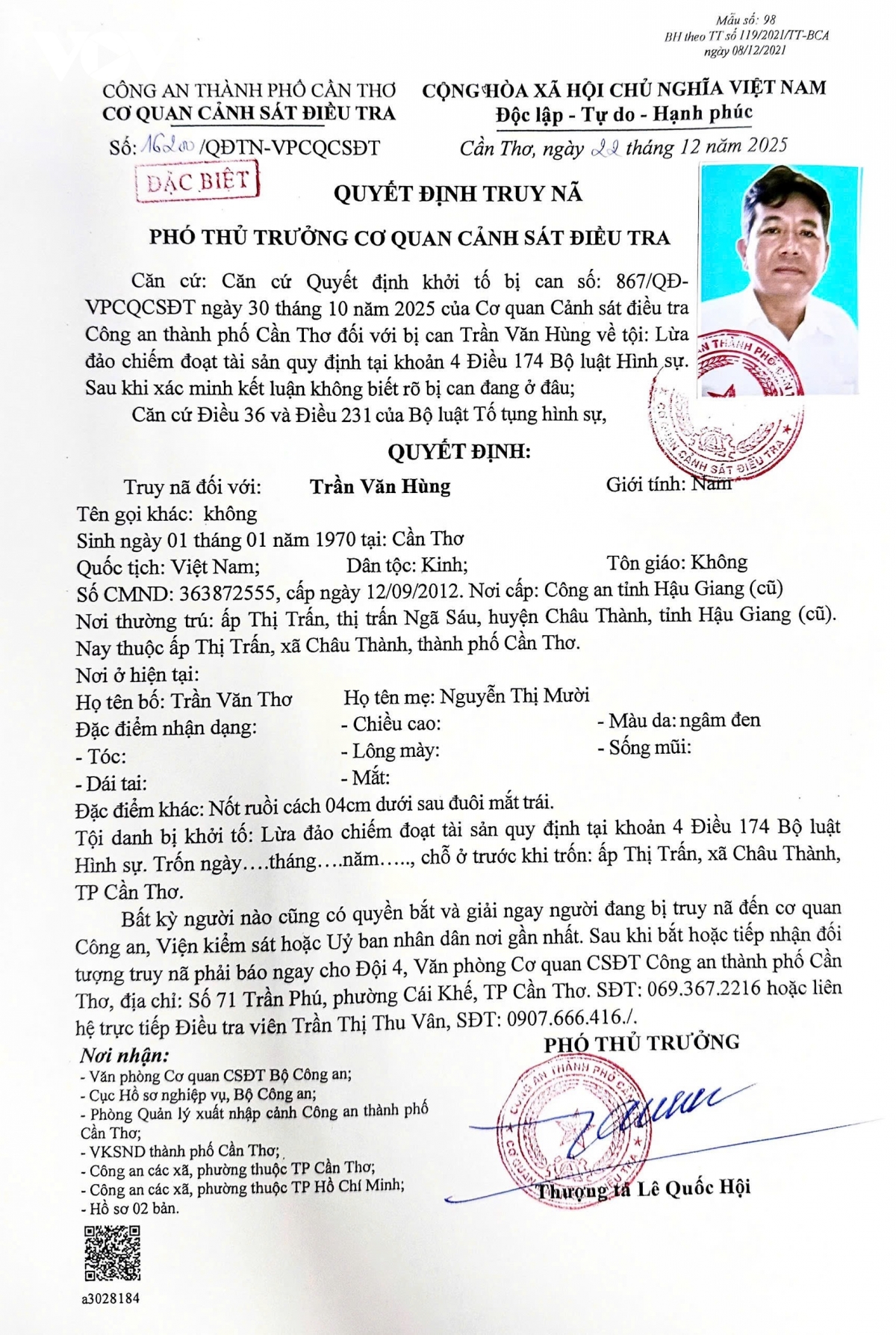 Trong Quyết định truy nã, Công an đề nghị người dân phát hiện bị can Hùng ở đâu có thể báo ngay cho Văn phòng Cơ quan CSĐT Công an TP Cần Thơ (địa chỉ: số 71 Trần Phú, phường Cái Khế, TP Cần Thơ). Ngoài ra, người dân có thông tin liên quan bị can cũng có thể liên hệ cơ quan Công an gần nhất để báo tin.